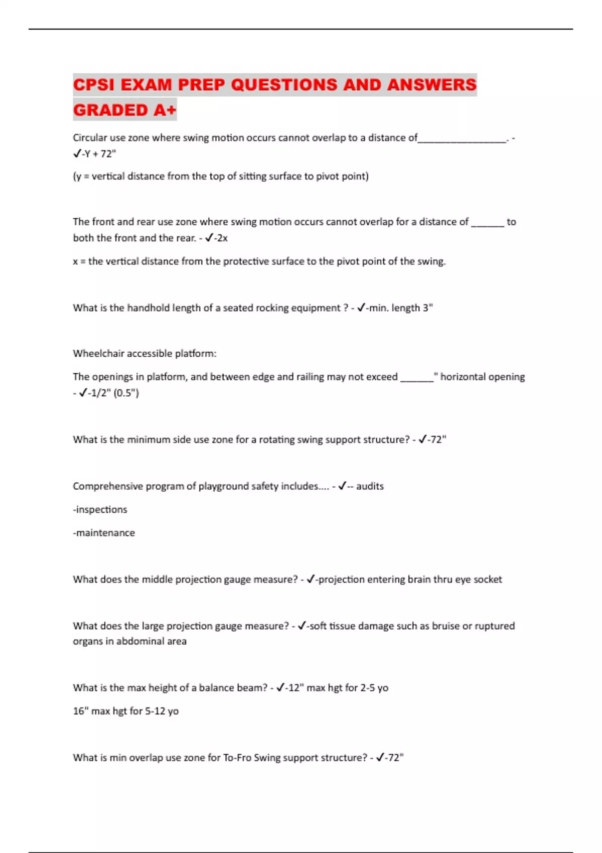 CPSI EXAM PREP QUESTIONS AND ANSWERS GRADED A+ Circular use zone where swing motion occurs cannot overlap to a distance of________________. - -Y + 72" (y = vertical distance from the top of sitting surface to pivot point) The front and rear use zone where swing motion occurs cannot overlap for a distance of ______ to both the front and the rear. - -2x x = the vertical distance from the protective surface to the pivot point of the swing. What is the handhold length of a seated rocking equipment ? - -min. length 3" Wheelchair accessible platform: The openings in platform, and between edge and railing may not exceed ______" horizontal opening - -1/2" (0.5") What is the minimum side use zone for a rotating swing support structure? - -72" Comprehensive program of playground safety includes.... - -- audits -inspections -maintenance What does the middle projection gauge measure? - -projection entering brain thru eye socket What does the large projection gauge measure? - -soft tissue damage such as bruise or ruptured organs in abdominal area What is the max height of a balance beam? - -12" max hgt for 2-5 yo 16" max hgt for 5-12 yo What is min overlap use zone for To-Fro Swing support structure? - -72