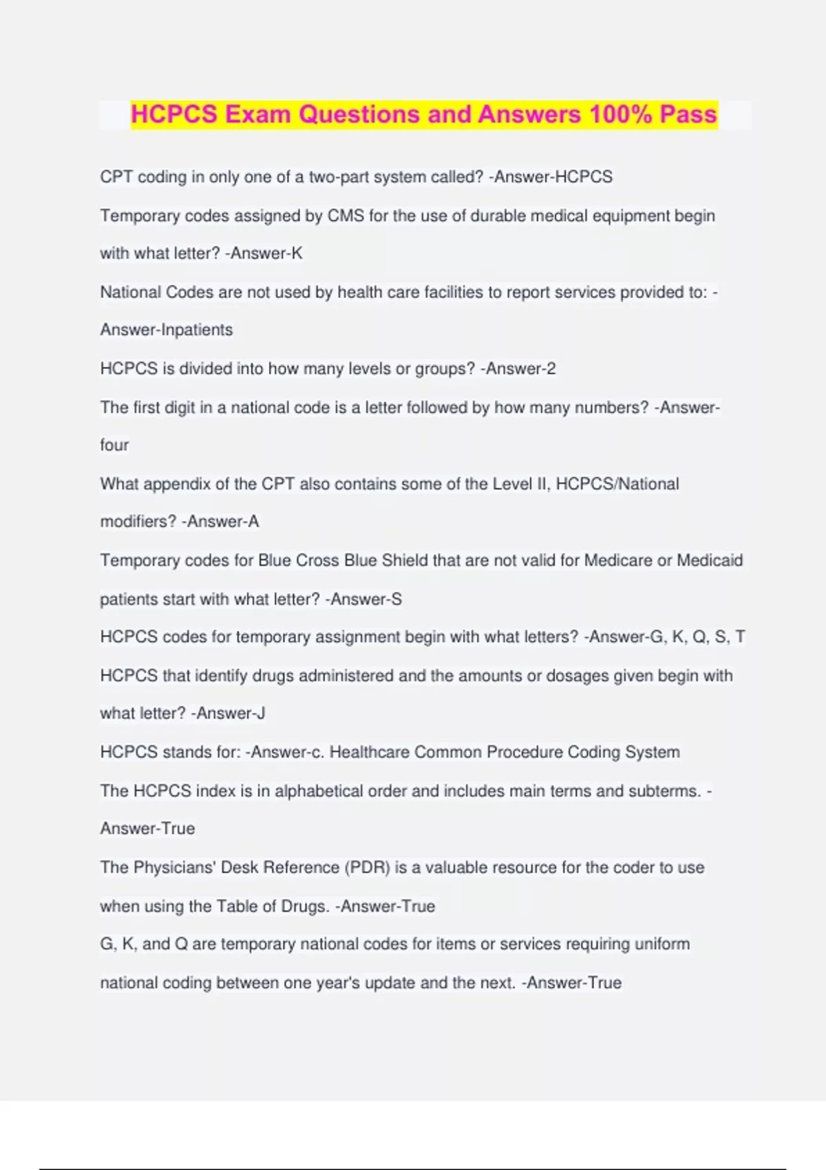 HCPCS Exam Questions and Answers 100% Pass CPT coding in only one of a two-part system called? -Answer-HCPCS Temporary codes assigned by CMS for the use of durable medical equipment begin with what letter? -Answer-K National Codes are not used by health care facilities to report services provided to: - Answer-Inpatients HCPCS is divided into how many levels or groups? -Answer-2 The first digit in a national code is a letter followed by how many numbers? -Answer- four What appendix of the CPT also contains some of the Level II, HCPCS/National modifiers? -Answer-A Temporary codes for Blue Cross Blue Shield that are not valid for Medicare or Medicaid patients start with what letter? -Answer-S HCPCS codes for temporary assignment begin with what letters? -Answer-G, K, Q, S, T HCPCS that identify drugs administered and the amounts or dosages given begin with what letter? -Answer-J HCPCS stands for: -Answer-c. Healthcare Common Procedure Coding System The HCPCS index is in alphabetical order and includes main terms and subterms. - Answer-True