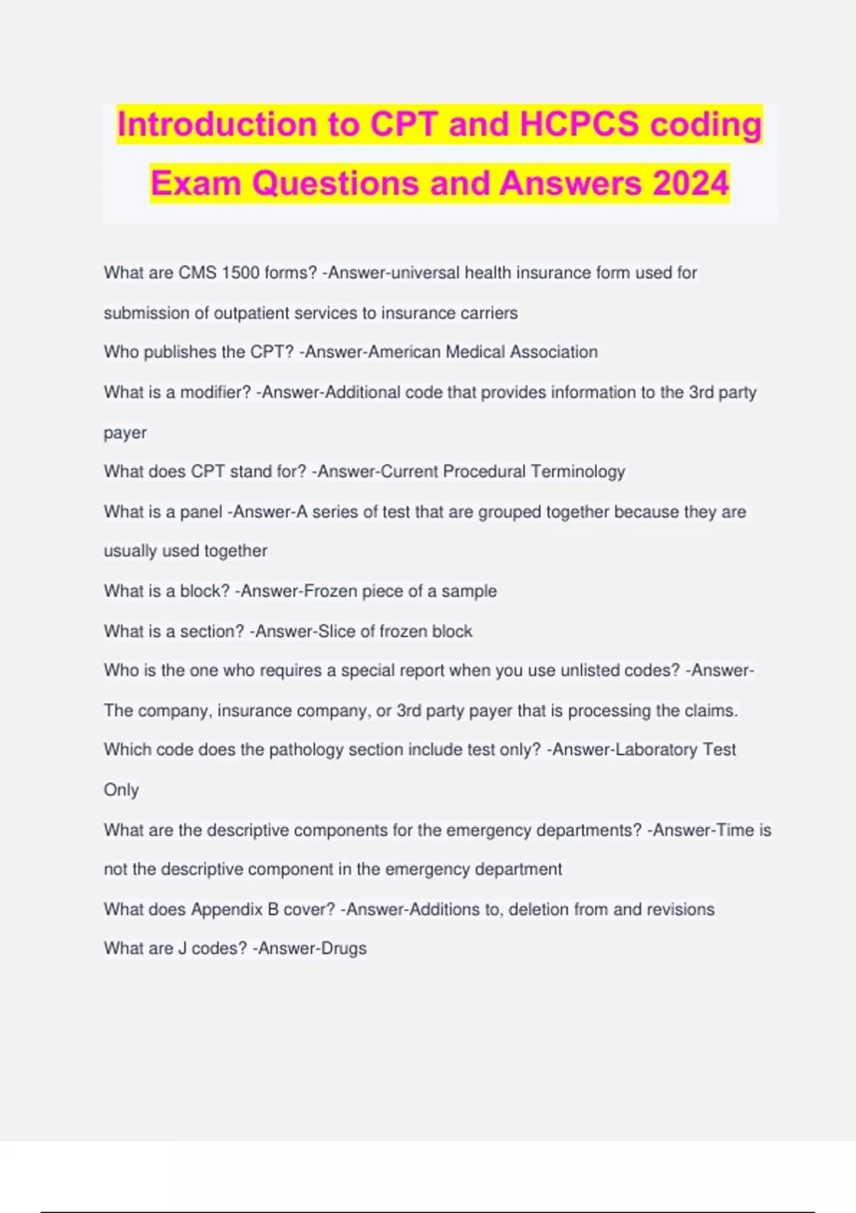 Introduction to CPT and HCPCS coding Exam Questions and Answers 2024 What are CMS 1500 forms? -Answer-universal health insurance form used for submission of outpatient services to insurance carriers Who publishes the CPT? -Answer-American Medical Association What is a modifier? -Answer-Additional code that provides information to the 3rd party payer What does CPT stand for? -Answer-Current Procedural Terminology What is a panel -Answer-A series of test that are grouped together because they are usually used together What is a block? -Answer-Frozen piece of a sample What is a section? -Answer-Slice of frozen block Who is the one who requires a special report when you use unlisted codes? -Answer- The company, insurance company, or 3rd party payer that is processing the claims. Which code does the pathology section include test only? -Answer-Laboratory Test Only What are the descriptive components for the emergency departments? -Answer-Time is not the descriptive component in the emergency department What does Appendix B cover? -Answer-Additions to, deletion from and revisions What are J codes? -Answer-Drugs What does appendix A contain? -Answer-List Of MODIFIERS that are used to ALTER or MODIFY Codes What is an add on code? -Answer-Identifies a code that is used in combination with a primary procedure What is a hyphen? -Answer-A range of Codes; the symbol used between two code numbers to indicate that a range is available What is the range of codes for a surgery procedure? -Answer- What is the reason for the CPT Coding System? -Answer-Health care providers to communicate both effectively & efficiently with the third party payer (To describe Health care Services) What is contained in the guidelines? -Answer-Provide specific information about coding in that section & contain valuable information for the coder What are the 6 elements that a special report must contain? -Answer-Nature, extent, need, time, effort and equipment What is a tracer? -Answer-An identifiable substance, such as a dye or a radioactive isotope What is the CPT codebook? -Answer-compilation of gui