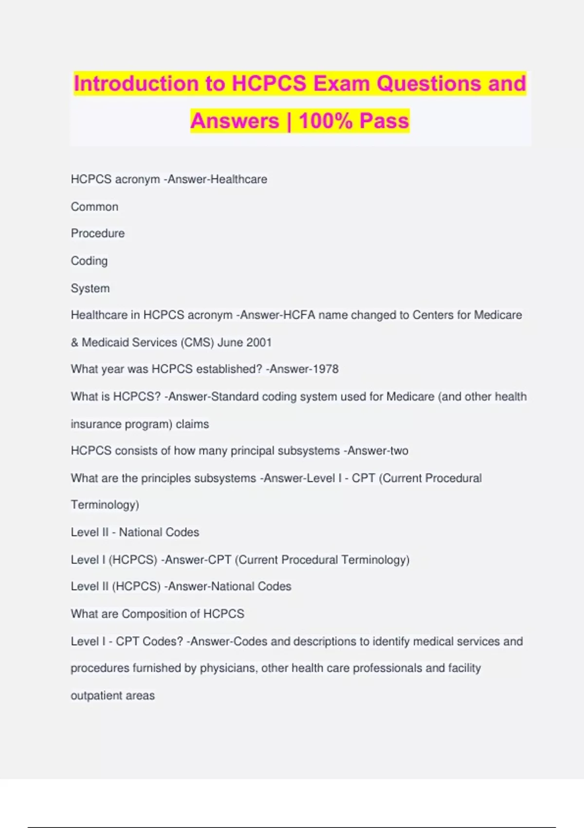 Introduction to HCPCS Exam Questions and Answers | 100% Pass HCPCS acronym -Answer-Healthcare Common Procedure Coding System Healthcare in HCPCS acronym -Answer-HCFA name changed to Centers for Medicare & Medicaid Services (CMS) June 2001 What year was HCPCS established? -Answer-1978 What is HCPCS? -Answer-Standard coding system used for Medicare (and other health insurance program) claims HCPCS consists of how many principal subsystems -Answer-two What are the principles subsystems -Answer-Level I - CPT (Current Procedural Terminology) Level II - National Codes Level I (HCPCS) -Answer-CPT (Current Procedural Terminology) Level II (HCPCS) -Answer-National Codes What are Composition of HCPCS Level I - CPT Codes? -Answer-Codes and descriptions to identify medical services and procedures furnished by physicians, other health care professionals and facility outpatient areas Who maintained the Composition of HCPCS Level I - CPT Codes? -Answer-AMA Composition of HCPCS Level I - CPT Codes are updated? -Answer-annually - January 1 Composition of HCPCS Level I - CPT Codes, "Code"? -Answer-5 digit, numeric code (e.g., 47652 - Laparoscopic Cholecystectomy) What is Composition of HCPCS Level II - National Codes? -Answer-Codes and descriptions for services and supplies (medical supplies, durable medical equipment, injections/drugs, orthotics and prosthetics, ophthalmologic services, etc.) Composition of HCPCS Level II - National Codes is maintained by? -Answer-CMS Composition of HCPCS Level II - National Codes is updated? -Answer-annually - January 1 Composition of HCPCS Level II - National Codes, "code"? -Answer-5 digit, alphanumeric code (letter A-V, except S&I, + 4 digits) (A0000-V9999) Composition of HCPCS Level II - National Codes, Letter of "code" -Answer-Letter denotes types of services or supplies e.g., J codes - drug codes; L codes - orthotics and prosthetic procedures and devices; G codes - temporary procedure and professional servic