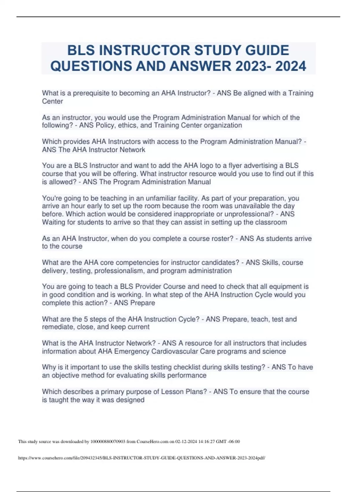 BLS INSTRUCTOR STUDY GUIDE QUESTIONS AND ANSWER