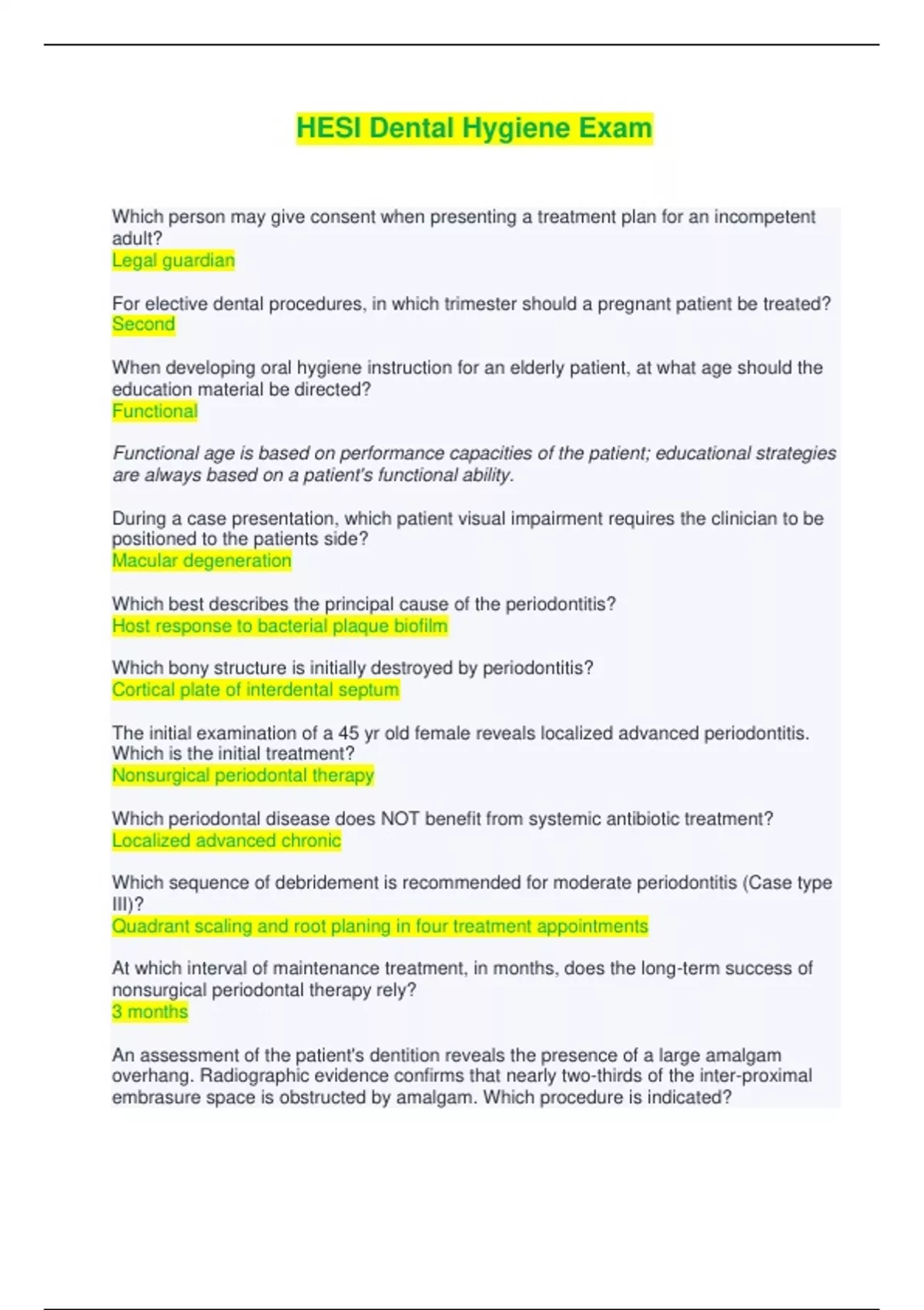 2024 HESI Dental Hygiene Exam - Q & A with Complete Solutions Which person may give consent when presenting a treatment plan for an incompetent adult? Legal guardian For elective dental procedures, in which trimester should a pregnant patient be treated? Second When developing oral hygiene instruction for an elderly patient, at what age should the education material be directed? Functional Functional age is based on performance capacities of the patient; educational strategies are always based on a patient's functional ability. During a case presentation, which patient visual impairment requires the clinician to be positioned to the patients side? Macular degeneration Which best describes the principal cause of the periodontitis? Host response to bacterial plaque biofilm Which bony structure is initially destroyed by periodontitis? Cortical plate of interdental septum The initial examination of a 45 yr old female reveals localized advanced periodontitis. Which is the initial treatment? Nonsurgical periodontal therapy Which periodontal disease does NOT benefit from systemic antibiotic treatment? Localized advanced chronic Which sequence of debridement is recommended for moderate periodontitis (Case type III)? Quadrant scaling and root planing in four treatment appointments At which interval of maintenance treatment, in months, does the long-term success of nonsurgical periodontal therapy rely? 3 months An assessment of the patient's dentition reveals the presence of a large amalgam overhang. Radiographic evidence confirms that nearly two-thirds of the inter-proximal embrasure space is obstructed by amalgam. Which procedure is indicated? Replacement of restoration Which is true regarding sutures? Sutures are always knotted buccal surfaces Periodontal dressings are used to stop gingival bleeding after periodontal surgery. Surgical wounds heal more quickly when protected by a periodontal dressing. Both statements are false Which are side effects of locally administered antibiotics? Nonexistent Which periodontal probing depth is recorded when the 3mm mark is just barely covered? 4mm The patient's periodontal evaluation reveals a localized 6mm probe reading accompanied by 3mm of recession and 1mm of mesiolingual mobility. Which figure in mm represents the clinical attachment loss? 9 mm CAL From which approach is the missal furcation of tooth #3 examined? Palatal Which assesses fremitus? Clinician's index finger Each oral finding is within normal limits EXCEPT one. Which one is the EXCEPTION? Ranula In which position is the hard and soft palate most visible? Supine; head tilted back and mouth wide open Which is the most common site for intraoral cancer? Lateral border of tongue Which extra-oral projection is used to evaluate skeletal relationships prior to orthodontic treatment? Lateral cephalometric Which classification does the ASA assign a patient with controlled angina pectoris? III The vast majority of disabled individuals earn a middle-class income. The cost of dental treatment is manageable for most patients with disabilities. Both statements are false