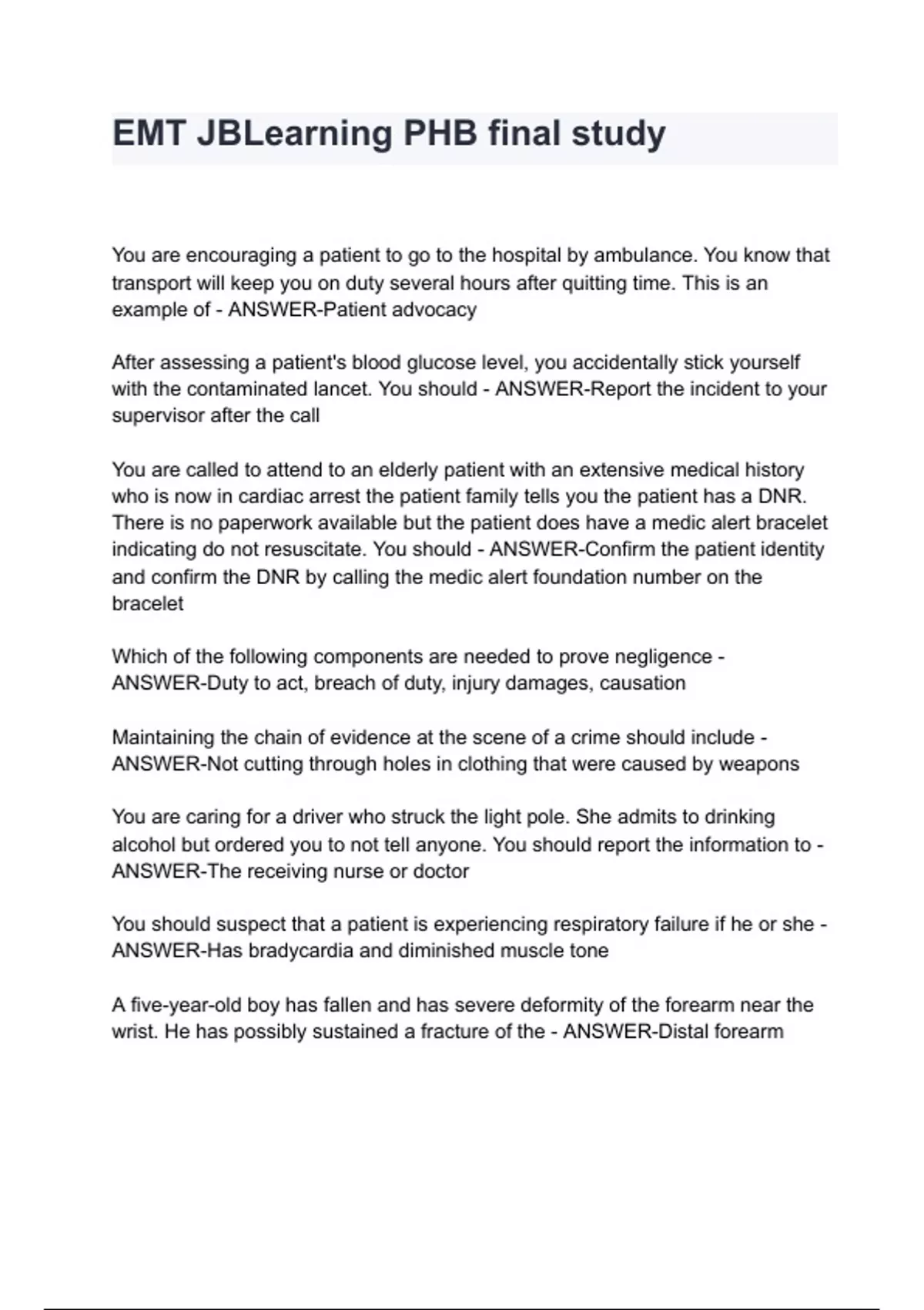 EMT JBLearning PHB final study questions with correct answers