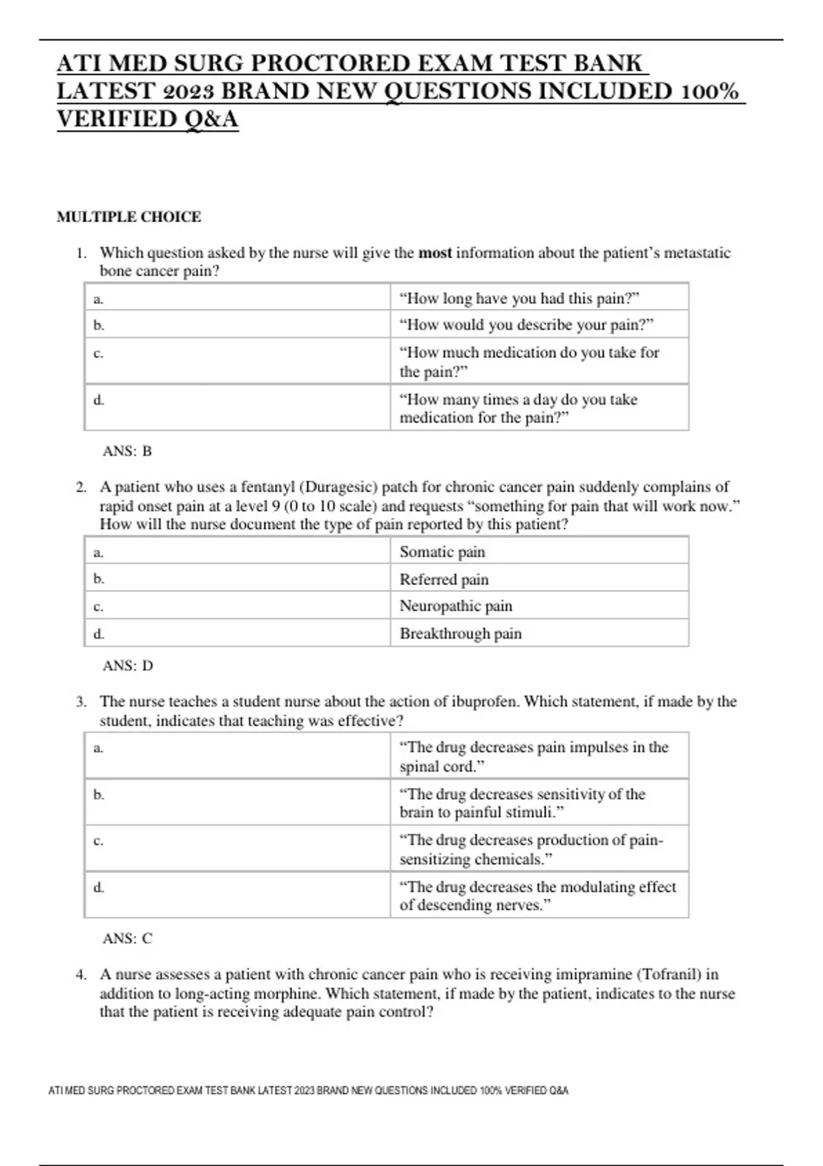 MULTIPLE CHOICE 1. Which question asked by the nurse will give the most information about the patient’s metastatic bone cancer pain? a. “How long have you had this pain?” b. “How would you describe your pain?” c. “How much medication do you take for the pain?” d. “How many times a day do you take medication for the pain?” ANS: B 2. A patient who uses a fentanyl (Duragesic) patch for chronic cancer pain suddenly complains of rapid onset pain at a level 9 (0 to 10 scale) and requests “something for pain that will work now.” How will the nurse document the type of pain reported by this patient? a. Somatic pain b. Referred pain c. Neuropathic pain