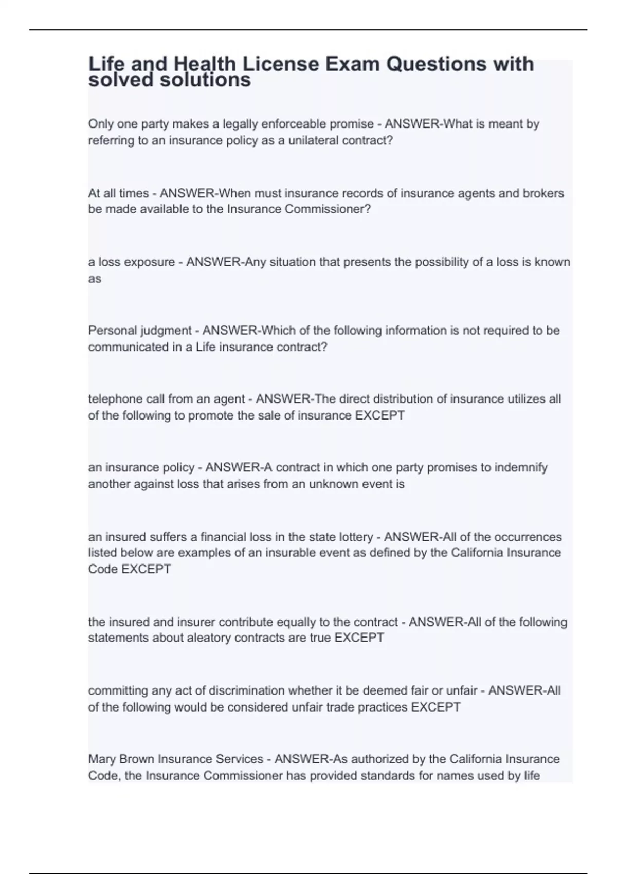 Only one party makes a legally enforceable promise - ANSWER-What is meant by referring to an insurance policy as a unilateral contract? At all times - ANSWER-When must insurance records of insurance agents and brokers be made available to the Insurance Commissioner? a loss exposure - ANSWER-Any situation that presents the possibility of a loss is known as Personal judgment - ANSWER-Which of the following information is not required to be communicated in a Life insurance contract? telephone call from an agent - ANSWER-The direct distribution of insurance utilizes all of the following to promote the sale of insurance EXCEPT an insurance policy - ANSWER-A contract in which one party promises to indemnify another against loss that arises from an unknown event is an insured suffers a financial loss in the state lottery - ANSWER-All of the occurrences listed below are examples of an insurable event as defined by the California Insurance Code EXCEPT the insured and insurer contribute equally to the contract - ANSWER-All of the following statements about aleatory contracts are true EXCEPT committing any act of discrimination whether it be deemed fair or unfair - ANSWER-All of the following would be considered unfair trade practices EXCEPT Mary Brown Insurance Services - ANSWER-As authorized by the California Insurance Code, the Insurance Commissioner has provided standards for names used by life insurance agents. Under these standards which, if any, of the following are automatically acceptable for Mary Brown, a holder of the CLU designation