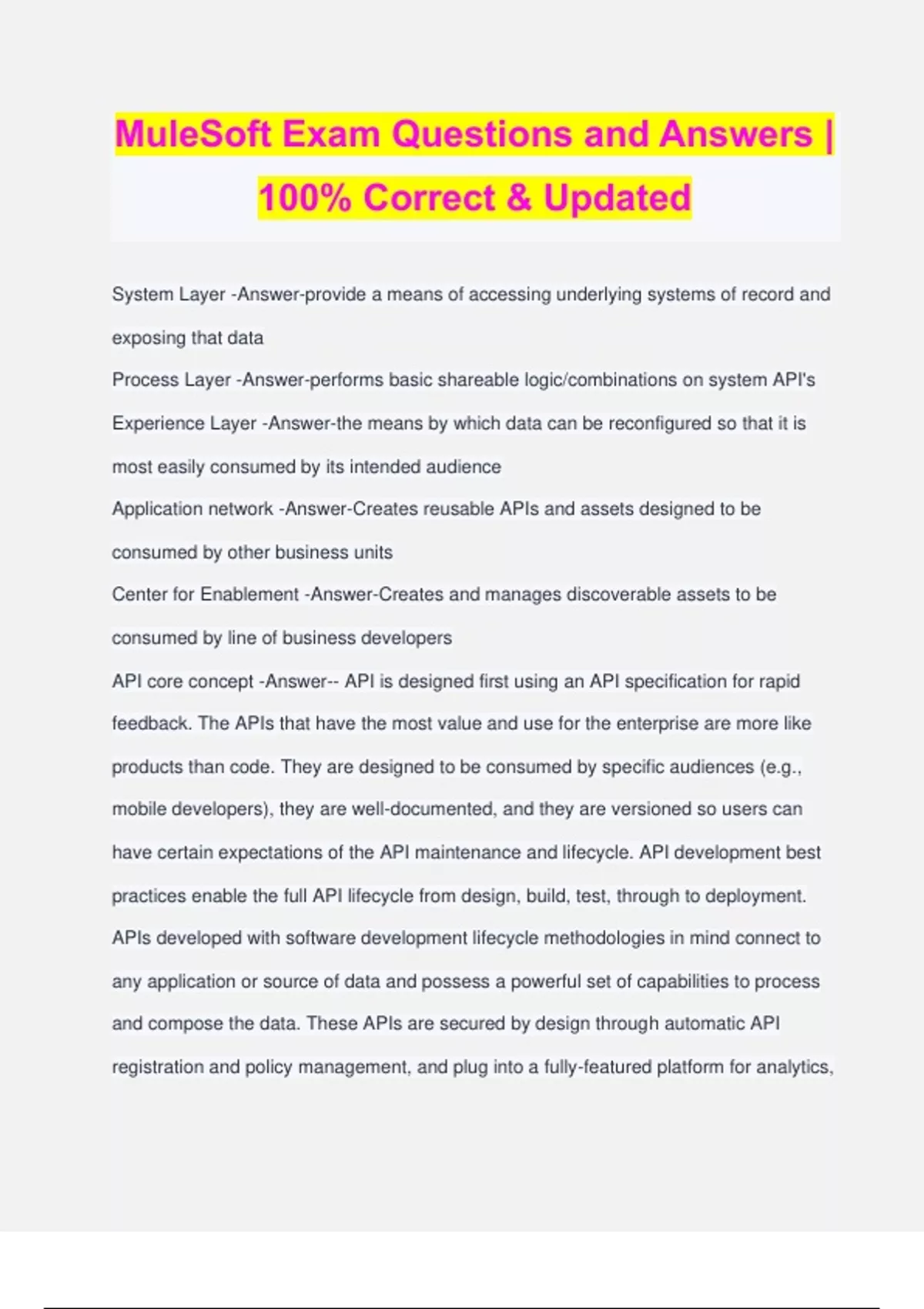 MuleSoft Exam Questions and Answers | 100% Correct & Updated System Layer -Answer-provide a means of accessing underlying systems of record and exposing that data Process Layer -Answer-performs basic shareable logic/combinations on system API's Experience Layer -Answer-the means by which data can be reconfigured so that it is most easily consumed by its intended audience Application network -Answer-Creates reusable APIs and assets designed to be consumed by other business units Center for Enablement -Answer-Creates and manages discoverable assets to be consumed by line of business developers API core concept -Answer-- API is designed first using an API specification for rapid feedback. The APIs that have the most value and use for the enterprise are more like products than code. They are designed to be consumed by specific audiences (e.g., mobile developers), they are well-documented, and they are versioned so users can have certain expectations of the API maintenance and lifecycle. API development best practices enable the full API lifecycle from design, build, test, through to deployment. APIs developed with software development lifecycle methodologies in mind connect to any application or source of data and possess a powerful set of capabilities to process and compose the data. These APIs are secured by design through automatic API registration and policy management, and plug into a fully-featured platform for analytics, portals and developer communities. Most importantly, APIs developed with these best practices are easy to build, productize, deploy and change. Change is a constant; therefore, the API should be a core strategic element in fast deployments, rapid changes, innovativeness, and experimentation. Methods -Answer-Get - Retrieves an existing entity Post - Creates a new entity Patch - Updates an existing entity Put - replaces an existing entity Flow designer -Answer-in Design Center allows users to design and develop fully functional Mule applications in a hosted development environment. Flow designer runs using a CloudHub worker Design Center -Answer-can be used to create API specs, Mule apps, and API fragments. APIkit -Answer-Validates requests against RAML API specifications and routes them to API implementations. This router determines the number of flows from a RAML by creating a separate flow for each HTTP method. event processor. -Answer-The minimum required configuration in a flow for a Mule application to compile is an event processor. database queries return what by default -Answer-By default database queries return Java. Mule 4 does not use -Answer-inboundProperties RAML correct reference to a fragment -Answer-examples: !include examples/BankAccountsE RAML format -Answer-Is separates elements by tabbing/indentation API autodiscovery -Answer-Allows a deployed Mule application to connect with API Manager to download policies and act as its own API proxy CloudHub worker -Answer-At most one Mule applications can run on a CloudHub worker API Gateway -Answer-Mule runtime uses its embedded API Gateway to enforce policies and limit access to APIs VM connectors -Answer-allow a flow to pass events to another flow asynchronously unlike Flow References CloudHub Packaging dependencies -Answer-CloudHub workers CANNOT download ALL possible project dependencies a project may contain and require dependencies to be included in the package ${} CloudHub -Answer-allows an HTTPS Listener to be accessed by external web clients after deployment to CloudHub Query parameters are dynamically passed to an outbound REST request as query parameters in the -Answer-HTTP Request operation What component can be used to build the SOAP envelope. -Answer-Transform Message The process to convert the array of JSON objects to an array of custom Java Account objects is to -Answer-add the Account object metadata to the output and use the drag- and-drop feature to transform the incoming JSON data