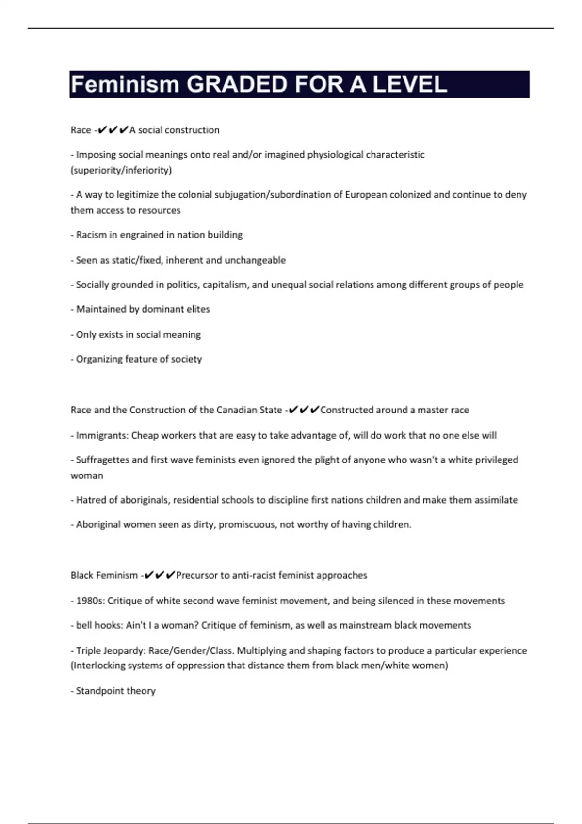 Race -A social construction - Imposing social meanings onto real and/or imagined physiological characteristic (superiority/inferiority) - A way to legitimize the colonial subjugation/subordination of European colonized and continue to deny them access to resources - Racism in engrained in nation building - Seen as static/fixed, inherent and unchangeable - Socially grounded in politics, capitalism, and unequal social relations among different groups of people - Maintained by dominant elites - Only exists in social meaning - Organizing feature of society Race and the Construction of the Canadian State -Constructed around a master race - Immigrants: Cheap workers that are easy to take advantage of, will do work that no one else will - Suffragettes and first wave feminists even ignored the plight of anyone who wasn't a white privileged woman - Hatred of aboriginals, residential schools to discipline first nations children and make them assimilate - Aboriginal women seen as dirty, promiscuous, not worthy of having children. Black Feminism -Precursor to anti-racist feminist approaches - 1980s: Critique of white second wave feminist movement, and being silenced in these movements - bell hooks: Ain't I a woman? Critique of feminism, as well as mainstream black movements - Triple Jeopardy: Race/Gender/Class. Multiplying and shaping factors to produce a particular experience (Interlocking systems of oppression that distance them from black men/white women) - Standpoint theory