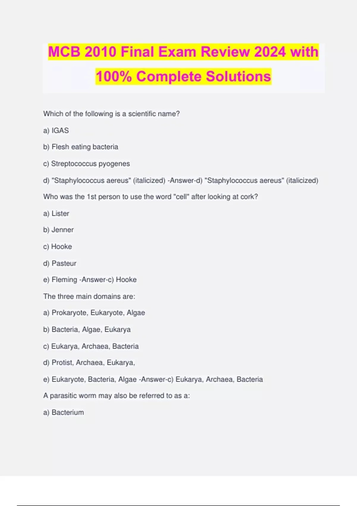 MCB 2010 Final Exam Review 2024 with 100% Complete Solutions Which of the following is a scientific name? a) IGAS b) Flesh eating bacteria c) Streptococcus pyogenes d) "Staphylococcus aereus" (italicized) -Answer-d) "Staphylococcus aereus" (italicized) Who was the 1st person to use the word "cell" after looking at cork? a) Lister b) Jenner c) Hooke d) Pasteur e) Fleming -Answer-c) Hooke The three main domains are: a) Prokaryote, Eukaryote, Algae b) Bacteria, Algae, Eukarya c) Eukarya, Archaea, Bacteria d) Protist, Archaea, Eukarya, e) Eukaryote, Bacteria, Algae -Answer-c) Eukarya, Archaea, Bacteria A parasitic worm may also be referred to as a: a) Bacterium b) Fungus c) Helminth d) Virus e) Yeast -Answer-C) Helminth Archaea differ from bacteria in that Arachaea: a) Lack nuclei b) Lack peptidoglycan c) Use organic compounds for food d) Reproduce by binary fission e) Are prokaryotic -Answer-b) Lack peptidoglycan What are the building blocks of proteins? a) Acetic acids b) Hydrochloric acid c) Amino acids d) ATP -Answer-c) Amino acids Movement of bacteria in response to chemicals is termed: a) Chemokine b) Hemolysis c) Hemotaxis d) Glycolysis e) Chemotaxis -Answer-e) Chemotaxis Which of the following is the correct order when classifying organisms from the largest (most broad) category to the smallest (most narrow) category? a) Species, genus, family, order, class, phylum, kingdom, domain b) Class, order, genus, family, species, domain, kingdom, phylum c) Domain, kingdom, phylum, class, order, family, genus, species d) Kingdom, domain, phylum, class, family, order, species, genus -Answer-c) Domain, kingdom, phylum, class, order, family, genus, species What is the side of the ribosomes in Eukaryotes? a) 50S b) 60S c) 70S d) 80S -Answer-d) 80S A ______________ is an organism that grows best at 37C? a) Psychorophile b) Thermophile c) Mesophile d) Psychrotroph e) Hyperthermophile -Answer-c) Mesophile The three types of RNA are: a) Transfer, Ribosome, Misssense b) Missense, Ribulin, Transmission c) Transformed, Ribosome, Messenger d) Transfer, Ribosomal, Messenger e) Transformed, Reference, Messenger -Answer-d) Transfer, Ribosomal, Messenger Which way will water move if you put a cell in a hypertonic solution? a) Into the cell b) Out of the cell c) There's no net movement -Answer-b) Out of the cell What is the purpose of the mordant in the Gram Stain? a) To hold the bacteria to the slide b) To make the bacteria big enough to see c) To complex with or hold the crystal violet d) To complex with Safranin e) To turn the cells orange -Answer-c) To complex with or hold the crystal violet Why are acidic stains seldom used when performing a simple stain? a) They're easy to use. b) They have a net positive charge. c) They have a net negative charg