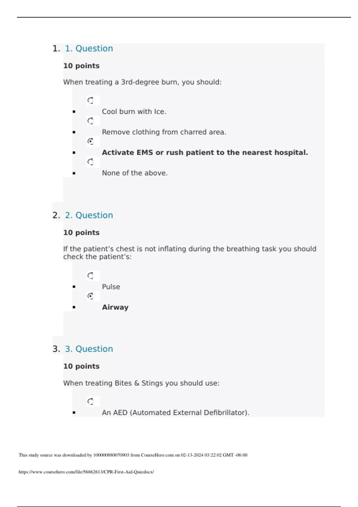 1. 1. Question 10 points When treating a 3rd-degree burn, you should: Cool burn with Ice. Remove clothing from charred area. Activate EMS or rush patient to the nearest hospital. None of the above. 2. 2. Question 10 points If the patient’s chest is not inflating during the breathing task you should check the patient’s: Pulse Airway 3. 3. Question 10 points When treati