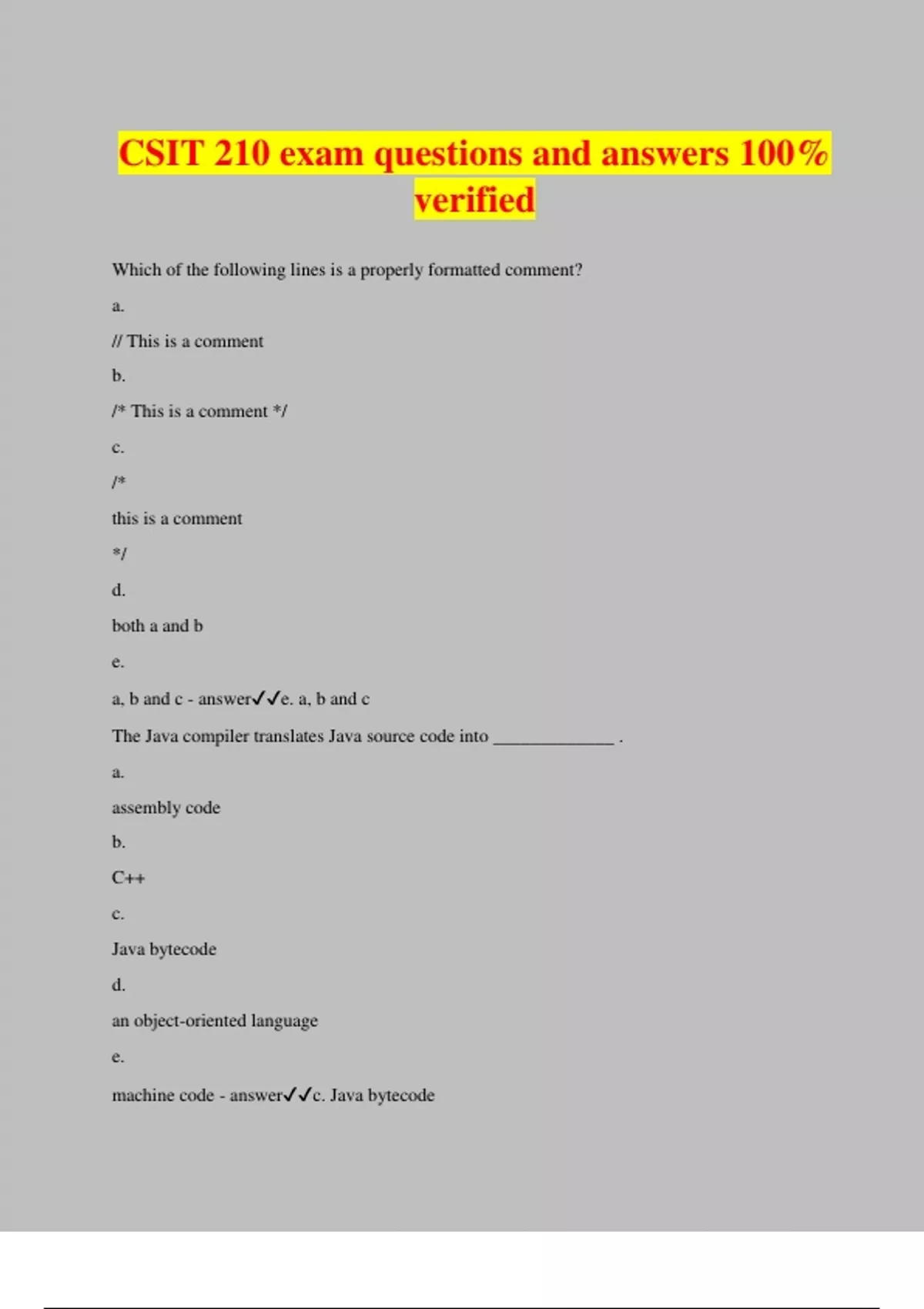 CSIT 210 exam questions and answers 100% verified Which of the following lines is a properly formatted comment? a. // This is a comment b. /* This is a comment */ c. /* this is a comment */ d. both a and b e. a, b and c - answere. a, b and c The Java compiler translates Java source code into _____________ . a. assembly code b. C++ c. Java bytecode d. an object-oriented language e. machine code - answerc. Java bytecode Classes can be created from other classes by using _______________ . a. machine code b. attributes c. polymorphism d. encapsulation e. inheritance - answere. inheritance Which of the following is not a valid Java identifier? a. thirdNumber b. answer_7 c. 2ndlevel d. highest$ e. anExtremelyLongIdentifierIfYouAskMe - answerc. 2ndlevel Which of the following might be included in an IDE? a. a compiler b. an editor c. a debugger d. all of the above e. none of the above - answerd. all of the above Which of the following describes the a