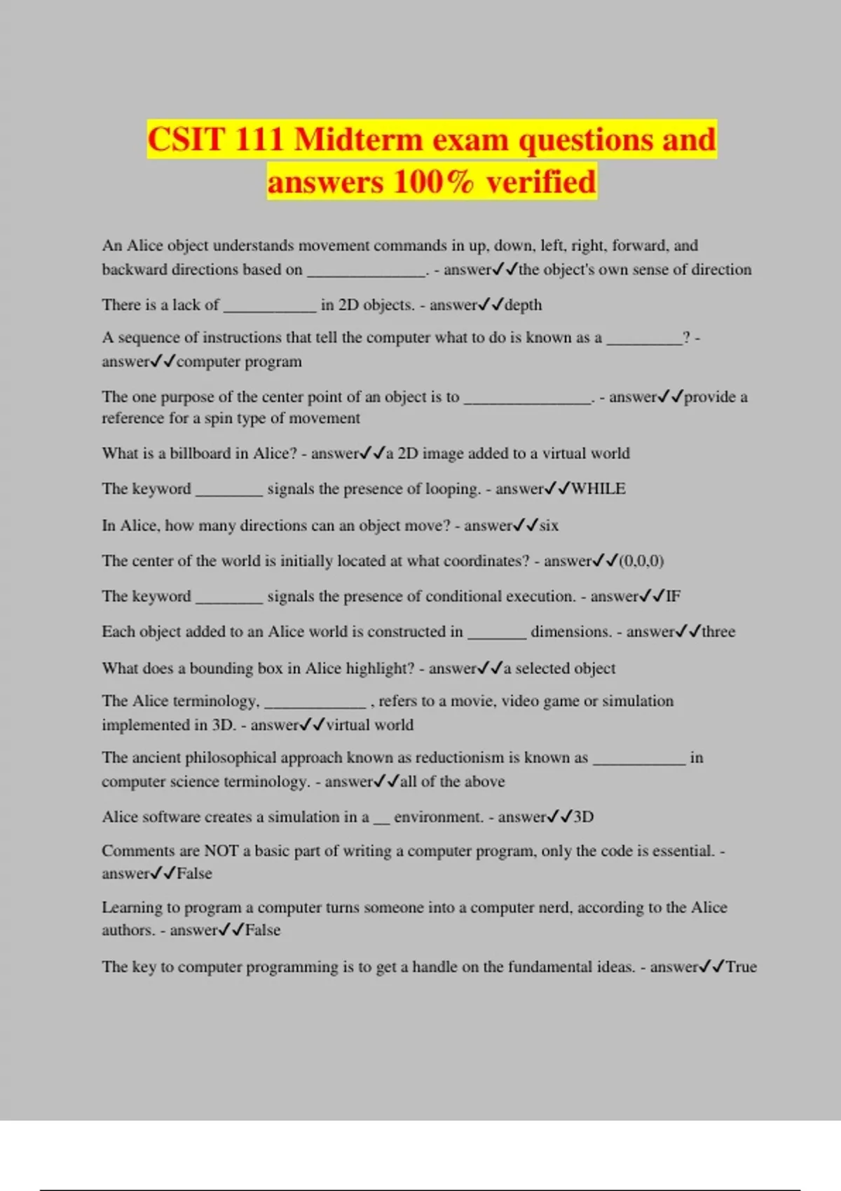 CSIT 111 Midterm exam questions and answers 100% verified An Alice object understands movement commands in up, down, left, right, forward, and backward directions based on ______________. - answerthe object's own sense of direction There is a lack of ___________ in 2D objects. - answerdepth A sequence of instructions that tell the computer what to do is known as a _________? - answercomputer program The one purpose of the center point of an object is to _______________. - answerprovide a reference for a spin type of movement What is a billboard in Alice? - answera 2D image added to a virtual world The keyword ________ signals the presence of looping. - answerWHILE In Alice, how many directions can an object move? - answersix The center of the world is initially located at what coordinates? - answer(0,0,0) The keyword ________ signals the presence of conditional execution. - answerIF Each object added to an Alice world is constructed in _______ dimensions. - answerthree What does a bounding box in Alice highlight? - answera selected object The Alice terminology, ____________ , refers to a movie, video game or simulation implemented in 3D. - answervirtual world The ancient philosophical approach known as reductionism is known as ___________ in computer science terminology. - answerall of the above Alice software creates a simulation in a __ environment. - answer3D Comments are NOT a basic part of writing a computer program, only the code is essential. - answerFalse Learning to program a computer turns someone into a computer nerd, according to the Alice authors. - answerFalse The key to computer programming is to get a handle on the fundamental ideas. - answerTrue