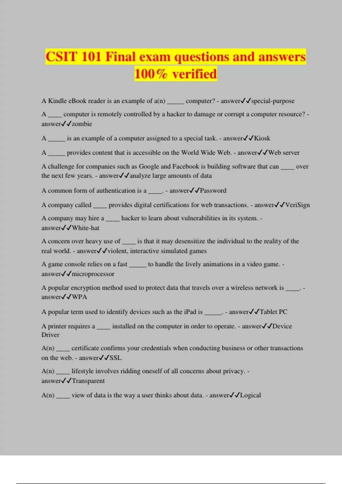 CSIT 101 Final exam questions and answers 100% verified A Kindle eBook reader is an example of a(n) _____ computer? - answerspecial-purpose A ____ computer is remotely controlled by a hacker to damage or corrupt a computer resource? - answerzombie A _____ is an example of a computer assigned to a special task. - answerKiosk A _____ provides content that is accessible on the World Wide Web. - answerWeb server A challenge for companies such as Google and Facebook is building software that can ____ over the next few years. - answeranalyze large amounts of data A common form of authentication is a ____. - answerPassword A company called ____ provides digital certifications for web transactions. - answerVeriSign A company may hire a ____ hacker to learn about vulnerabilities in its system. - answerWhite-hat A concern over heavy use of ____ is that it may desensitize the individual to the reality of the real world. - answerviolent, interactive simulated games A game console relies on a fast _____ to handle the lively animations in a video game. - answermicroprocessor A popular encryption method used to protect data that travels over a wireless network is ____. - answerWPA A popular term used to identify devices such as the iPad is _____. - answerTablet PC A printer requires a ____ installed on the computer in order to operate. - answerDevice Driver A(n) ____ certificate confirms your credentials when conducting business or other transactions on the web. - answerSSL A(n) ____ lifestyle involves ridding oneself of all concerns about privacy. - answerTransparent A(n) ____ view of data is the way a user thinks about data. - answerLogical AI applications are ways in which AI methodologies are applied to ____ and provide services. - answerSolves Problems All of the following are examples of malware EXCEPT ____. - answerUpdates An Internet-based crime is referred to as a(n) ____ crime. - answerCyber An act of ____ would be posting a story to a blog saying that a neighbor is selling drugs, when you know that it's not true. - answerLibel An email with a subject heading "Urgent Security Update" that requests a username and password followed by a link to "re-login and resolve the issue" is a good example of a ____ scam. - answerPhishing An icon on your desktop is a component of a ____ interface. - answergraphical user An important function of a firewall is to protect all the ____ of a network or computer from undesirable data - answerPort