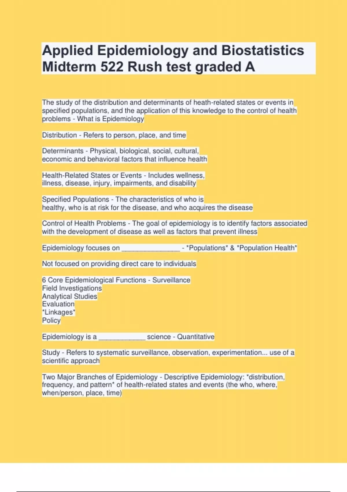 Applied Epidemiology and Biostatistics Midterm 522 Rush test graded A