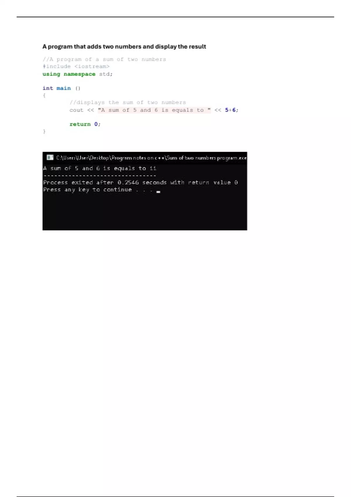 cout << "A sum of 5 and 6 is equals to " << 5+6;