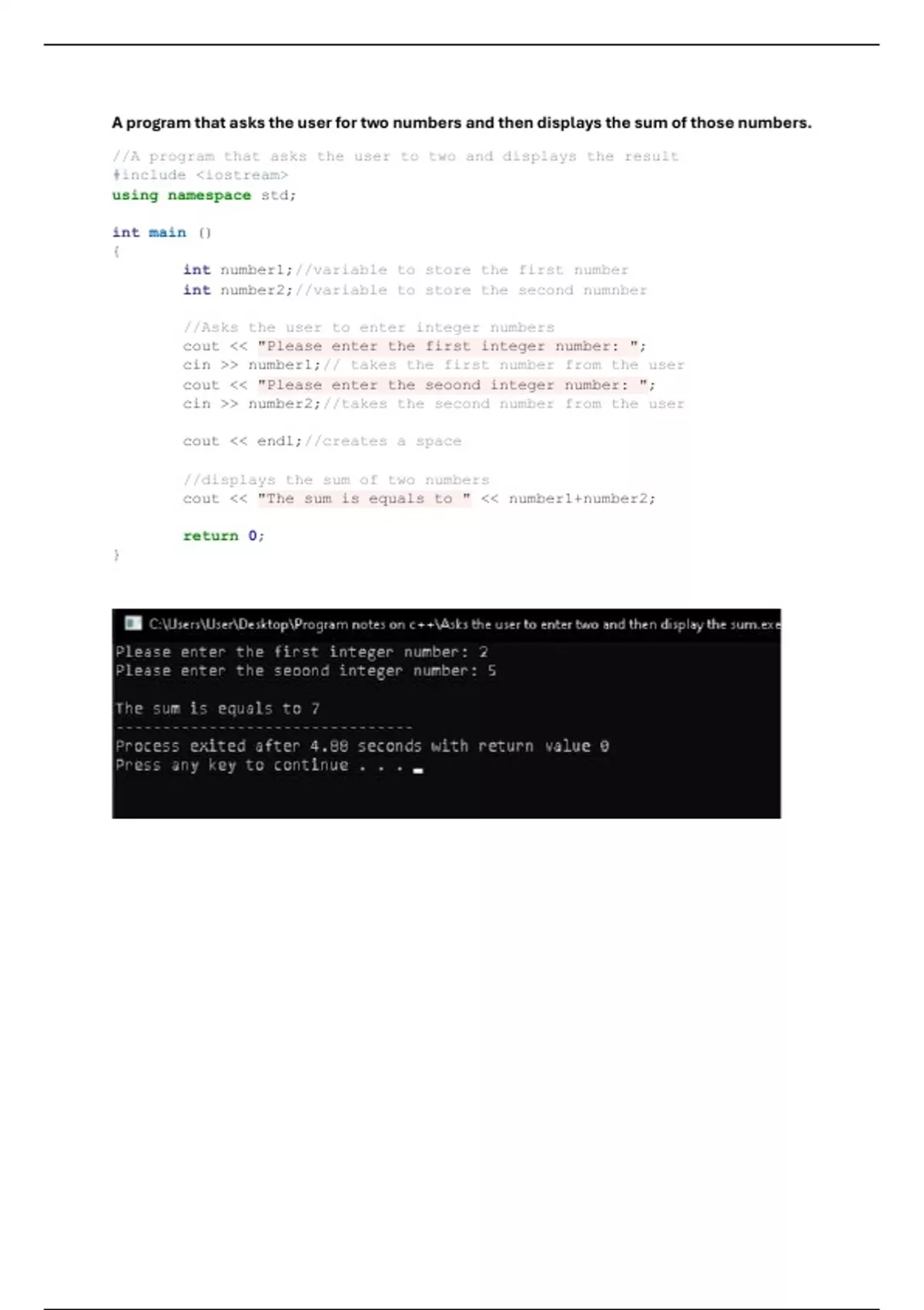 A program that asks the user for two numbers and then displays the sum of those numbers.