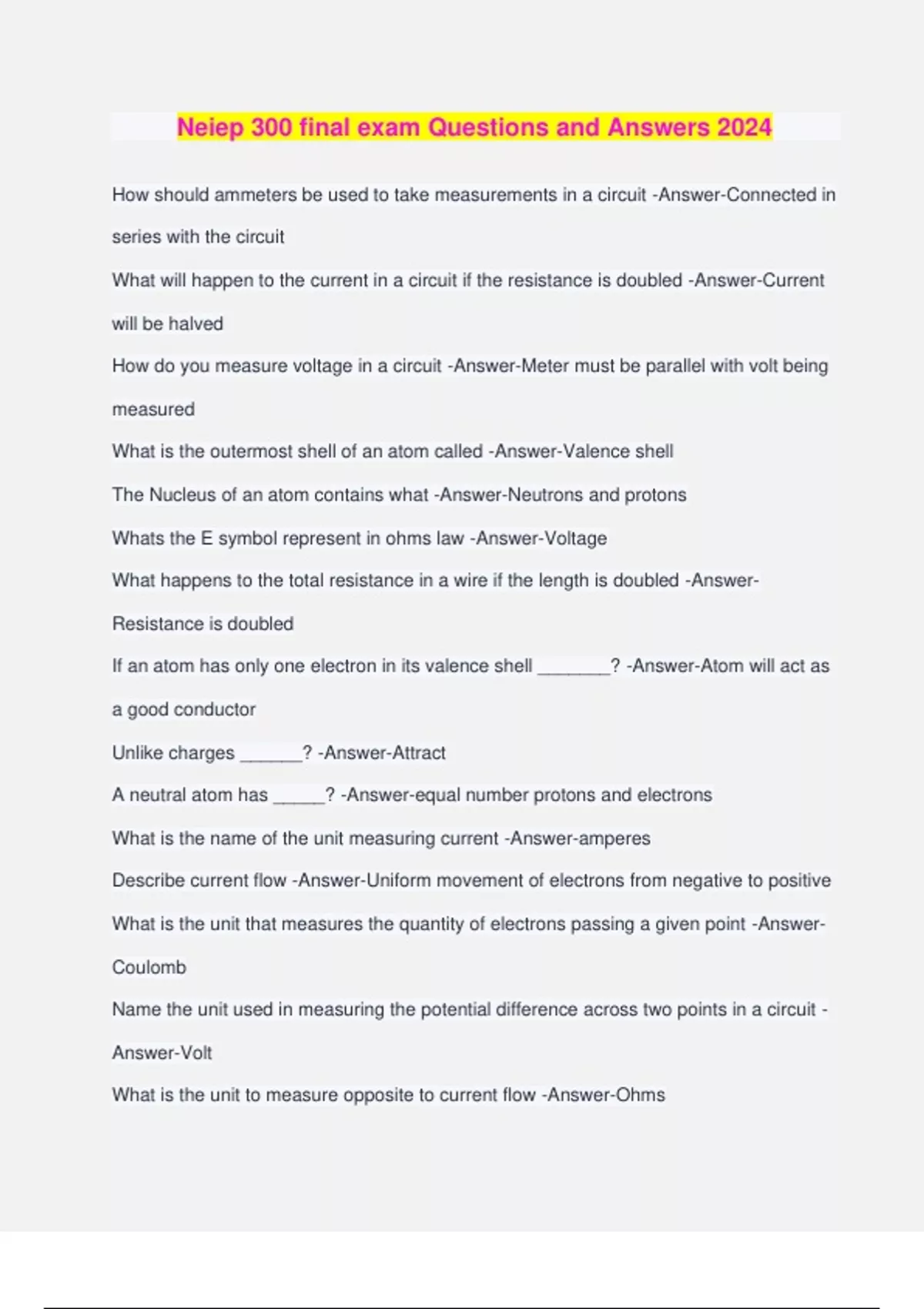 Neiep 300 final exam Questions and Answers 2024 How should ammeters be used to take measurements in a circuit -Answer-Connected in series with the circuit What will happen to the current in a circuit if the resistance is doubled -Answer-Current will be halved How do you measure voltage in a circuit -Answer-Meter must be parallel with volt being measured What is the outermost shell of an atom called -Answer-Valence shell The Nucleus of an atom contains what -Answer-Neutrons and protons Whats the E symbol represent in ohms law -Answer-Voltage What happens to the total resistance in a wire if the length is doubled -Answer- Resistance is doubled If an atom has only one electron in its valence shell _______? -Answer-Atom will act as a good conductor Unlike charges ______? -Answer-Attract A neutral atom has _____? -Answer-equal number protons and electrons What is the name of the unit measuring current -Answer-amperes Describe current flow -Answer-Uniform movement of electrons from negative to positive What is the unit that measures the quantity of electrons passing a given point -Answer- Coulomb Name the unit used in measuring the potential difference across two points in a circuit - Answer-Volt What is the unit to measure opposite to current flow -Answer-Ohms What happens to resistance in a wire, if its width is increased four times -Answer- Resistance is 1/4 What does the designation DPDTNO switch represent -Answer-Double-pole, Double- Throw, Normally Open switch _____ refer to the moveable contacts on a switch -Answer-Poles Contact wear is always _______ on DC switches than AC switches -Answer-greater Describe maintained contact switch action -Answer-When the switch is actuated once, contacts close an remain close What type of switch would be found at a terminal landing -Answer-Unidirectional limit switch What are the resistance band colors -Answer-Black, Brown, Red, Orange, Yellow ,Green, Blue, Violet, Grey, White What is the tolerance on a gold band resistance -Answer-5% What is the tolerance on a silver band resistance -Answer-10% What is the tolerance when there is no band color -Answer-20% Which resistor has a single fixed terminal and shaft driven, m