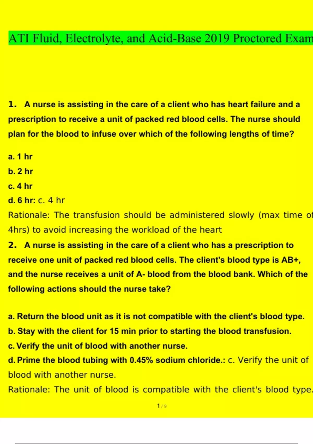 ATI Fluid, Electrolyte, and Acid-Base 2019 Proctored Exam-with 100% verified solutions