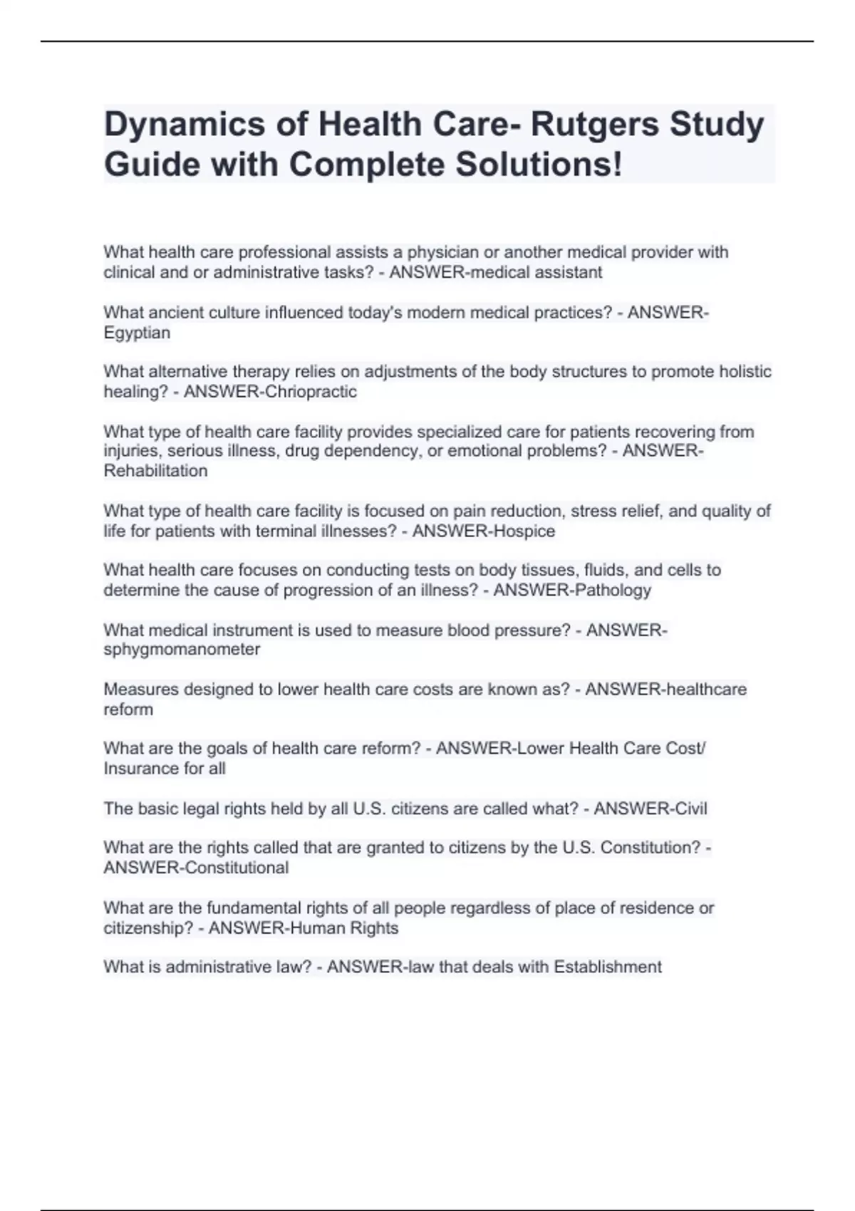 Dynamics of Health Care- Rutgers Study Guide with Complete Solutions!