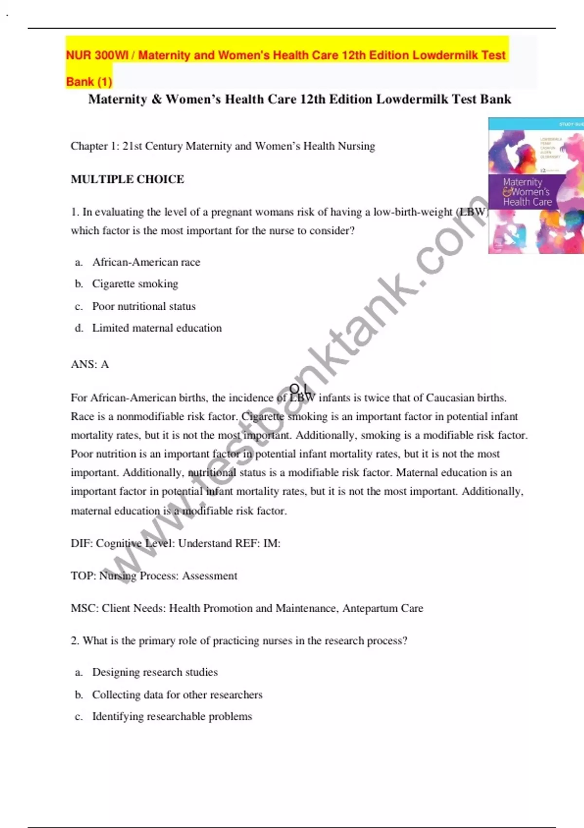 Test Bank For Maternity and Women's Health Care 12th Edition Lowdermilk Chapter1-37 | Complete Guide 2022 This is NOT a book! This is a Test Bank (Study Questions) to help you study for your Tests. No delay, the download is quick and instantaneous right after you checkout! Test banks can give you the tools you need to help you study better. This download has no waiting period so that means that you will be able to download this test bank right away.