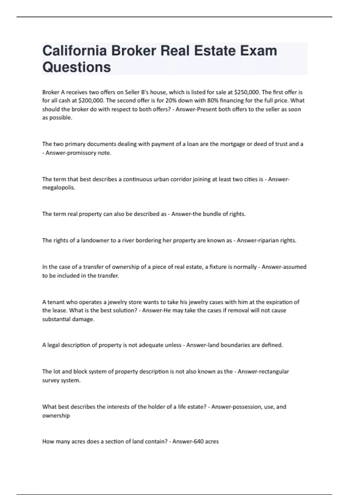 Broker A receives two offers on Seller B's house, which is listed for sale at $250,000. The first offer is for all cash at $200,000. The second offer is for 20% down with 80% financing for the full price. What should the broker do with respect to both offers? - Answer-Present both offers to the seller as soon as possible. The two primary documents dealing with payment of a loan are the mortgage or deed of trust and a - Answer-promissory note. The term that best describes a continuous urban corridor joining at least two cities is - Answermegalopolis. The term real property can also be described as - Answer-the bundle of rights. The rights of a landowner to a river bordering her property are known as - Answer-riparian rights. In the case of a transfer of ownership of a piece of real estate, a fixture is normally - Answer-assumed to be included in the transfer. A tenant who operates a jewelry store wants to take his jewelry cases with him at the expiration of the lease. What is the best solution? - Answer-He may take the cases if removal will not cause substantial damage. A legal description of property is not adequate unless - Answer-land boundaries are defined. The lot and block system of property description is not also known as the - Answer-rectangular survey system. What best describes the interests of the holder of a life estate? - Answer-possession, use, and ownership How many acres does a section of land contain? - Answer-640 acresThe requirement that multiple owners take title to property at the same time is a characteristic of - Answer-joint tenancy. The type of ownership that provides the most complete bundle of rights is - Answer-fee simple absolute. Which are most similar to each other with respect to inheriting property? - Answer-joint tenancy and community property with right of survivorship (both allow for reversion to remaining owners) A statement of the goals and policies regarding growth of a community is a good definition of the - Answer-general plan. The primary difference between a common interest subdivision and a standard subdivision is - Answer-ownership of common areas. Which of the following is a generic term for a group of people joining together to invest in real estate? - Answer-syndicate The proper way for a landowner who has physical difficulty in developing his property to get relief is to obtain a - Answer-variance. When is a landowner entitled to compensation for a change in zoning? - Answer-when the landowner is denied all practical economic use of the property