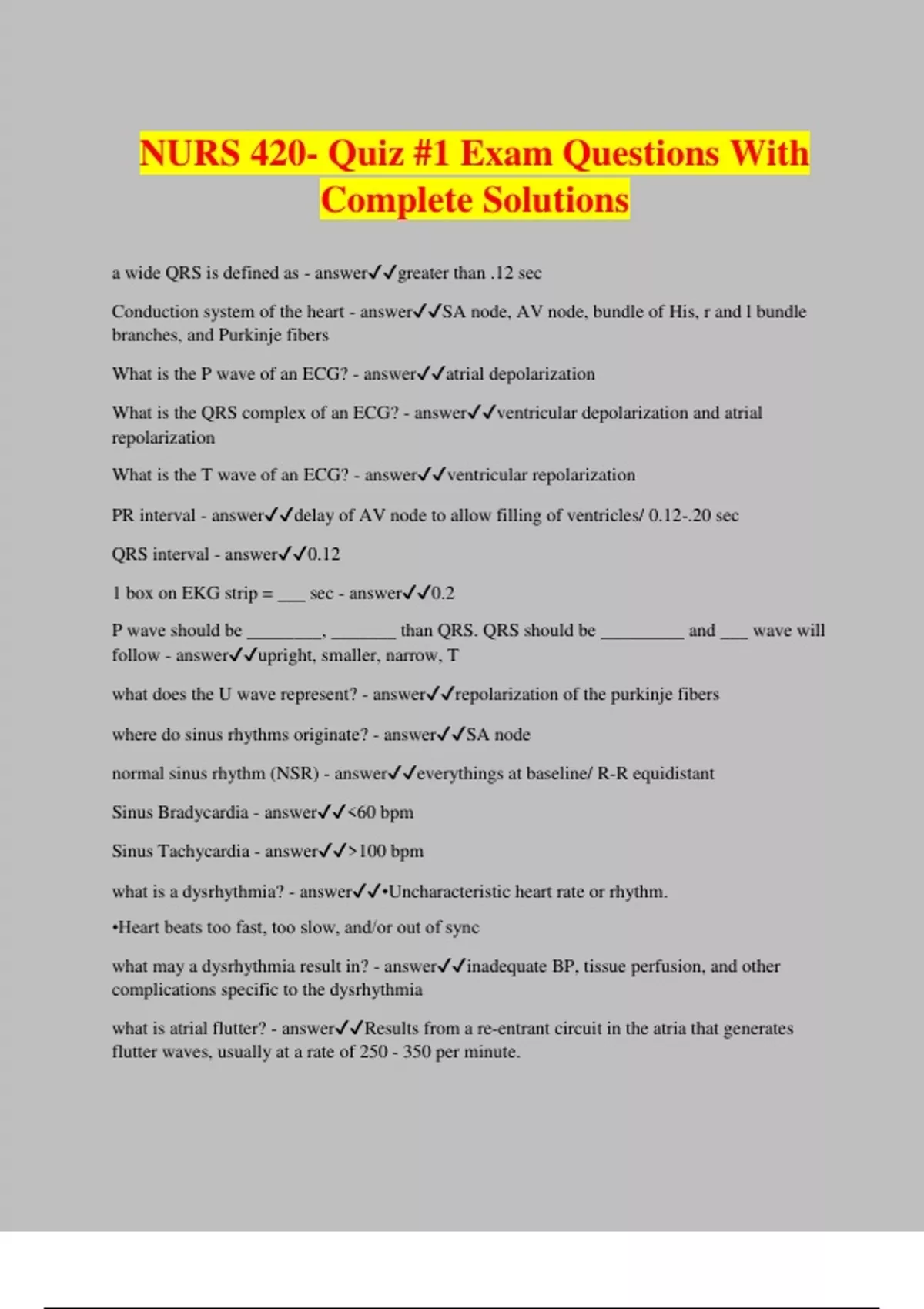 NURS 420- Quiz #1 Exam Questions With Complete Solutions a wide QRS is defined as - answergreater than .12 sec Conduction system of the heart - answerSA node, AV node, bundle of His, r and l bundle branches, and Purkinje fibers What is the P wave of an ECG? - answeratrial depolarization What is the QRS complex of an ECG? - answerventricular depolarization and atrial repolarization What is the T wave of an ECG? - answerventricular repolarization PR interval - answerdelay of AV node to allow filling of ventricles/ 0.12-.20 sec QRS interval - answer0.12 1 box on EKG strip = ___ sec - answer0.2 P wave should be ________, _______ than QRS. QRS should be _________ and ___ wave will follow - answerupright, smaller, narrow, T what does the U wave represent? - answerrepolarization of the purkinje fibers where do sinus rhythms originate? - answerSA node normal sinus rhythm (NSR) - answereverythings at baseline/ R-R equidistant Sinus Bradycardia - answer<60 bpm Sinus Tachycardia - answer>100 bpm what is a dysrhythmia? - answer•Uncharacteristic heart rate or rhythm. •Heart beats too fast, too slow, and/or out of sync what may a dysrhythmia result in? - answerinadequate BP, tissue perfusion, and other complications specific to the dysrhythmia what is atrial flutter? - answerResults from a re-entrant circuit in the atria that generates flutter waves, usually at a rate of 250 - 350 per minute. what kind of pattern is indicative of a flutter? - answersawtooth d/t atria beating way faster than ventricles What is atrial fibrillation? - answerdisorganized electrical signals leading to atria just jiggling, vibrating/ no distinguishable P waves what risk does a fib cause? - answerclot formation and emboli d/t blood stasis what impacts CO in afib? - answertachy rate or rapid ventricular rate steps to take for a pt w a fib w rapid ventricular response (RVR)? - answer•Amiodarone (antidysrhythmic) for rate and rhythm control. •May also use beta blocker, digoxin to slow HR and control beats •Synchronized cardioversion •Anti-platelet & anticoagulant meds what do you want in therapeutic level before synchronized cardioversion? - answerPT, PTT so you don't send emboli out if a. fib w RVR doesn't convert, we will need to? - answercontrol rate and coagulability to limit clot formation what is an AV block? - answerDiminished or eliminated conduction from atria to ventricles/ p wave but no QRST what are the most common causes of AV blocks in about 50% of pts? 40%? 10%? - answerheart disease causing fibrosis and sclerosis of the conduction system/ ischemic heart disease/ drug related: digoxin, beta blockers whats a common tx for AV blocks? another tx? - answerpacemaker implantation/ med adjustment how can digoxin cause an AV block? - answerslows conduction through AV node What's a premature ventricular contraction (PVC)? - answernot particularly concerning/ signal from ventricle comes before P wave (before SA node sends signal) when do PVCs become more of a concern? - answerwhen they become more freq and organized couplet PVCs - answer2 PVCs in a row triplet PVCs - answerOccur in groups of three Trigeminy PVCs - answerevery third beat is a PVC Bigeminy PVC - answerevery other beat is a PVC multifocal PVC - answerinc excitability in ventricles Ventricular tachycardia (V-tach) - answercan be pulseless or pulse V-Tach with pulse Immediate ATTN •Maintain an _____ _______- Asst resp as needed •Monitor cardiac ______, ______, blood__________ •Supplemental oxygen to maintain O2 >___% •IV access - __________, calcium channel blockers and beta blockers, to ____ HR - answeropen airway rhythm, BP, oxygenation 94 antidysrhythmics, slow what's the immediate intervention for pulseless v tach? why is someone pulseless? - answer•Synchronized cardioversion per ACLS protocol/ hearts beating so fast their not perfusing what will happen if vtach is left untx? - answerconvert to v fib ventricular fibrillation - answerabnormally fast and chaotic heart rate: ventricles quiver rather than beat/ no QRS v fib immediate action •Initiate _____ •________ immediately with __________ per ACLS protocol - ___ shocks •Administer ________ and _______ per ACLS protocol •Monitor cardiac______, ____, ____ sat - answerCPR shock, defibrillator, 3 EPI, amiodarone rhythm, BP, O2 Idioventricular Rhythms - answerOnly purkinje fibers firing WIDE QRS always/ accelerated and agonal Pulseless Electrical Activity (PEA) - answercondition in which electrical activity is present on an electrocardiogram, but there is not an adequate pulse or blood pressure Asystole - answerabsence of contractions of the heart what are some causes for dysrhythmias? - answer•Age-related cardiac damage •CAD, heart disease or heart attack •A complication of heart surgery •Thyroid disease •Obstructive sleep apnea what meds cause brady-dysrhythmias? - answer•Medications such as sedatives, opioids, or cardiac meds like digoxin, beta-blockers (brady-dysrhythmias) what meds cause tachy-dysrhythmias? - answer•Nicotine and illegal drugs, such as amphetamines and cocaine (tachy-dysrhythmias) what are some s/sx of dysrhythmias? - answer•Palpita