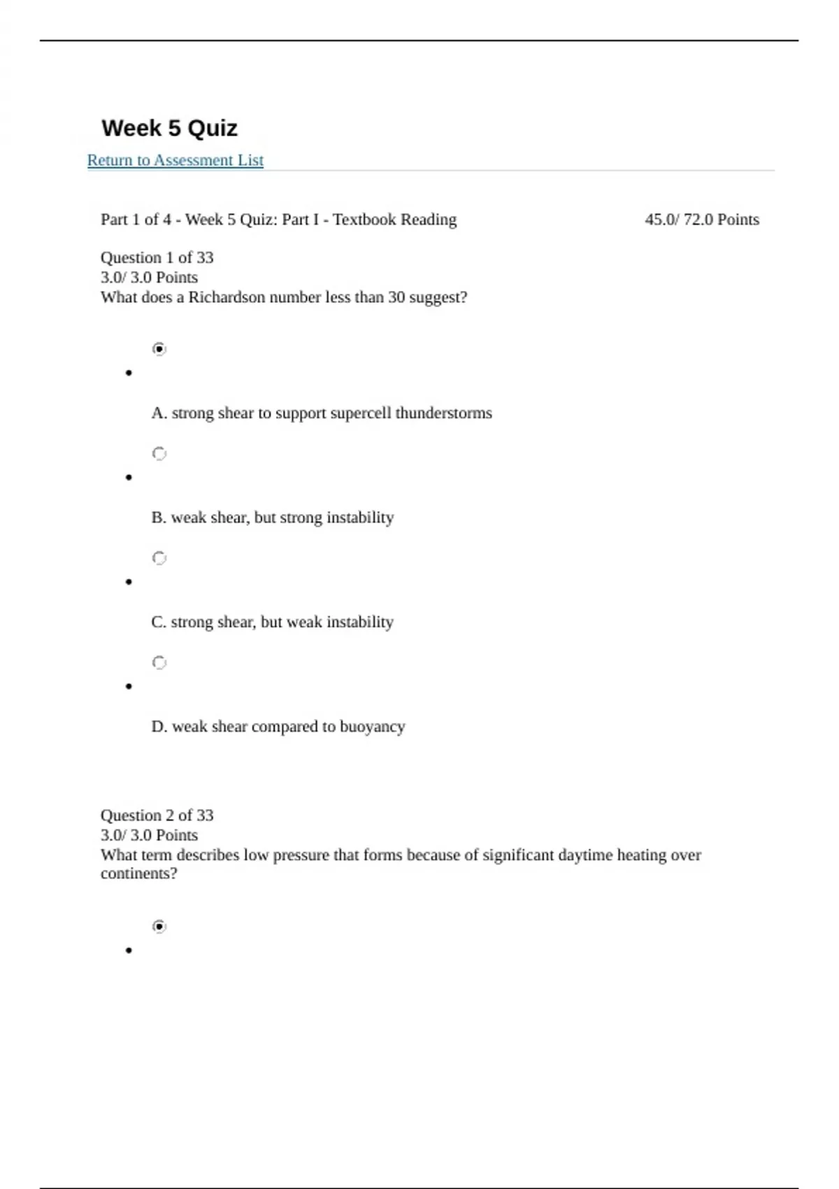 Week 5 Quiz Return to Assessment List Part 1 of 4 - Week 5 Quiz: Part I - Textbook Reading 45.0/ 72.0 Points Question 1 of 33 3.0/ 3.0 Points What does a Richardson number less than 30 suggest? A. strong shear to support supercell thunderstorms B. weak shear, but strong instability C. strong shear, but weak instability D. weak shear compared to buoyancy Question 2 of 33 3.0/ 3.0 Points What term describes low pressure that forms because of significant daytime heating over continents? A. thermal low B. cold low C. polar low D. lee cyclone Question 3 of 33 3.0/ 3.0 Points Which of the following is the forecasting for weather within the next two hours? A. long-range forecasts B. nowcasts C. climate forecasts