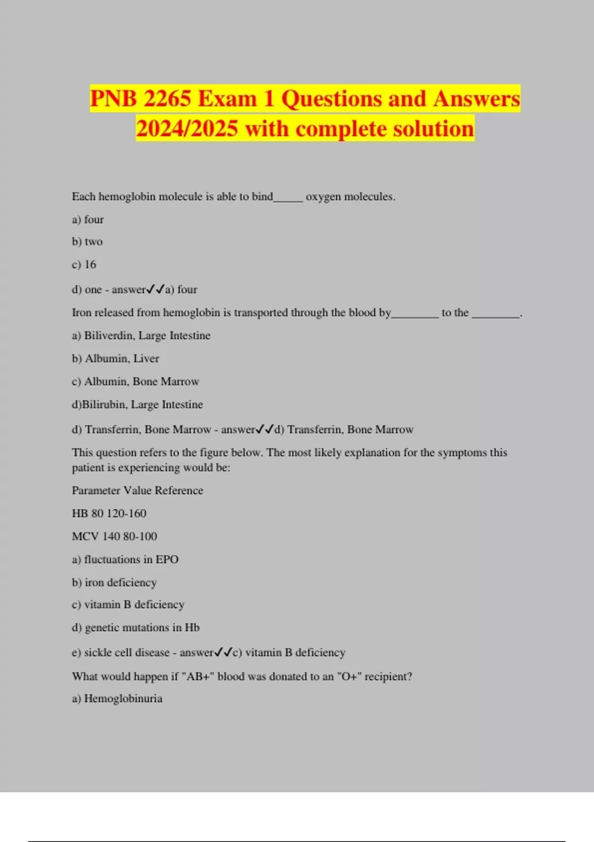 PNB 2265 Exam 1 Questions and Answers 2024/2025 with complete solution Each hemoglobin molecule is able to bind_____ oxygen molecules. a) four b) two c) 16 d) one - answera) four Iron released from hemoglobin is transported through the blood by________ to the ________. a) Biliverdin, Large Intestine b) Albumin, Liver c) Albumin, Bone Marrow d)Bilirubin, Large Intestine d) Transferrin, Bone Marrow - answerd) Transferrin, Bone Marrow This question refers to the figure below. The most likely explanation for the symptoms this patient is experiencing would be: Parameter Value Reference HB MCV a) fluctuations in EPO b) iron deficiency c) vitamin B deficiency d) genetic mutations in Hb e) sickle cell disease - answerc) vitamin B deficiency What would happen if "AB+" blood was donated to an "O+" recipient? a) Hemoglobinuria b) Jaundice c) Hemolytic Disease d) Nothing - answera) Hemoglobinuria LIKE skeletal muscle, cardiac muscle cells________ a) attach to each other via desmosomes b) are striated c) produce tetanic contractions d) all of the above - answerb) are striated Saul suffers from Atransferrinemia, a genetic disorder where the protein Transferrin is not produced. Which of the following might Saul experience? a) jaundice b) hemoglobinuria c) kidney damage d) all of the above - answerc) kidney damage During the fetal stage of life, UNLIKE during adulthood a) Sickle Cell Anemia is less severe because Fetal Hb contains gamma chains b) Sickle Cell Anemia is less sever because oxygen is carried by maternal Hb c) Sickle Cell Anemia is more sever because Fetal Hb has a higher affinity for oxygen d) Sickle Cell Anemia is more sever because Fetal Hb contains only Beta chains - answera) sickle cell anemia is less severe because Fetal Hb contains gamma chains Skeletal muscle and cardiac muscle are similar in all of the following ways EXCEPT: a) Skeletal muscle is multinucleate b) Skeletal muscle uses calcium for contractions c) Skeletal muscle has actin and myosin d) Skeletal muscle is striated e) Skeletal muscle is non- mitotic - answera) skeletal muscle is multinucleated Which of the following is responsible for dissolving (