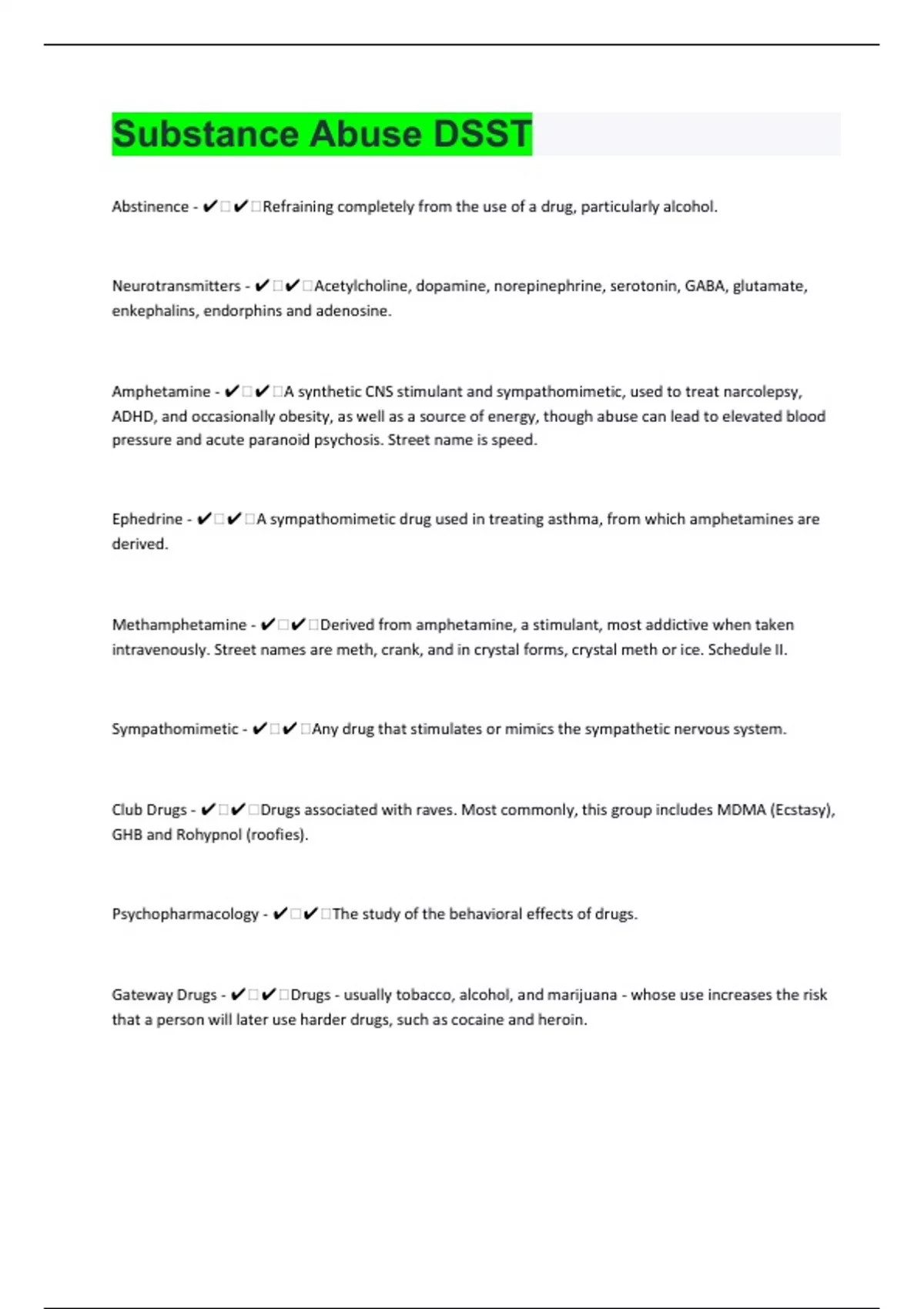 Abstinence - ️️Refraining completely from the use of a drug, particularly alcohol. Neurotransmitters - ️️Acetylcholine, dopamine, norepinephrine, serotonin, GABA, glutamate, enkephalins, endorphins and adenosine. Amphetamine - ️️A synthetic CNS stimulant and sympathomimetic, used to treat narcolepsy, ADHD, and occasionally obesity, as well as a source of energy, though abuse can lead to elevated blood pressure and acute paranoid psychosis. Street name is speed. Ephedrine - ️️A sympathomimetic drug used in treating asthma, from which amphetamines are derived. Methamphetamine - ️️Derived from amphetamine, a stimulant, most addictive when taken intravenously. Street names are meth, crank, and in crystal forms, crystal meth or ice. Schedule II. Sympathomimetic - ️️Any drug that stimulates or mimics the sympathetic nervous system. Club Drugs - ️️Drugs associated with raves. Most commonly, this group includes MDMA (Ecstasy), GHB and Rohypnol (roofies). Psychopharmacology - ️️The study of the behavioral effects of drugs. Gateway Drugs - ️️Drugs - usually tobacco, alcohol, and marijuana - whose use increases the risk that a person will later use harder drugs, such as cocaine and heroin.