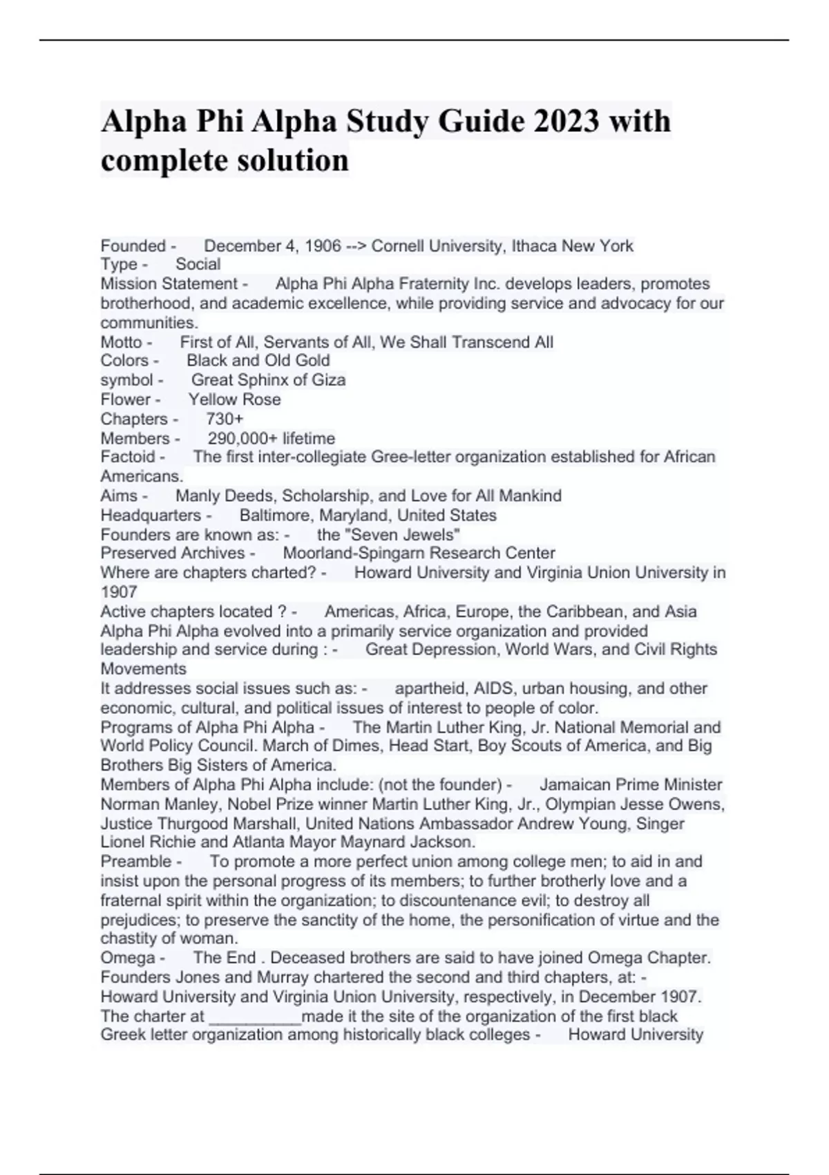 Alpha Phi Alpha Study Guide 2023 with complete solution Founded - December 4, 1906 -- Cornell University, Ithaca New York Type - Social Mission Statement - Alpha Phi Alpha Fraternity Inc. develops leaders, promotes brotherhood, and academic excellence, while providing service and advocacy for our communities. Motto - First of All, Servants of All, We Shall Transcend All Colors - Black and Old Gold symbol - Great Sphinx of Giza Flower - Yellow Rose Chapters - 730+ Members - 290,000+ lifetime Factoid - The first inter-collegiate Gree-letter organization established for African Americans. Aims - Manly Deeds, Scholarship, and Love for All Mankind Headquarters - Baltimore, Maryland, United States Founders are known as: - the "Seven Jewels" Preserved Archives - Moorland-Spingarn Research Center Where are chapters charted? - Howard University and Virginia Union University in 1907 Active chapters located ? - Americas, Africa, Europe, the Caribbean, and Asia Alpha Phi Alpha evolved into a primarily service organization and provided leadership and service during : - Great Depression, World Wars, and Civil Rights Movements It addresses social issues such as: - apartheid, AIDS, urban housing, and other economic, cultural, and political issues of interest to people of color. Programs of Alpha Phi Alpha - The Martin Luther King, Jr. National Memorial and World Policy Council. March of Dimes, Head Start, Boy Scouts of America, and Big Brothers Big Sisters of America. Members of Alpha Phi Alpha include: (not the founder) - Jamaican Prime Minister Norman Manley, Nobel Prize winner Martin Luther King, Jr., Olympian Jesse Owens, Justice Thurgood Marshall, United Nations Ambassador Andrew Young, Singer Lionel Richie and Atlanta Mayor Maynard Jackson. Preamble - To promote a more perfect union among college men; to aid in and insist upon the personal progress of its members; to further brotherly love and a fraternal spirit within the organization; to discountenance evil; to destroy all prejudices; to preserve the sanctity of the home, the personification of virtue and the chastity of woman. Omega - The End . Deceased brothers are said to have joined Omega Chapter. Founders Jones and Murray chartered the second and third chapters, at: - Howard University and Virginia Union University, respectively, in December 1907. The charter at __________made it the site of the organization of the first black Greek letter organization among historically black colleges - Howard University The purpose and objective of the fraternity within the articles of incorporation were declared : - "educational and for the mutual uplift of its members."