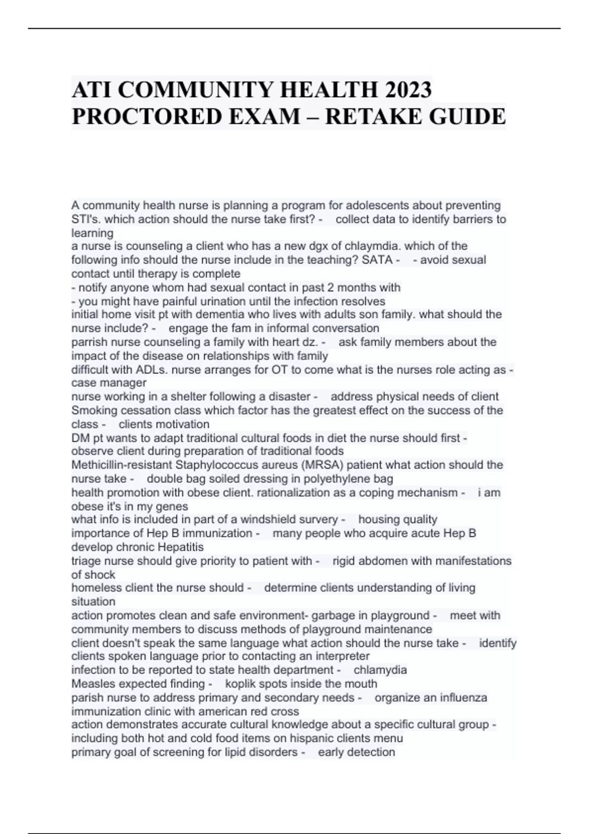 ATI COMMUNITY HEALTH 2023 PROCTORED EXAM – RETAKE GUIDE A community health nurse is planning a program for adolescents about preventing STI's. which action should the nurse take first? - collect data to identify barriers to learning a nurse is counseling a client who has a new dgx of chlaymdia. which of the following info should the nurse include in the teaching? SATA - - avoid sexual contact until therapy is complete - notify anyone whom had sexual contact in past 2 months with - you might have painful urination until the infection resolves initial home visit pt with dementia who lives with adults son family. what should the nurse include? - engage the fam in informal conversation parrish nurse counseling a family with heart dz. - ask family members about the impact of the disease on relationships with family difficult with ADLs. nurse arranges for OT to come what is the nurses role acting as - case manager nurse working in a shelter following a disaster - address physical needs of client Smoking cessation class which factor has the greatest effect on the success of the class - clients motivation DM pt wants to adapt traditional cultural foods in diet the nurse should first - observe client during preparation of traditional foods Methicillin-resistant Staphylococcus aureus (MRSA) patient what action should the nurse take - double bag soiled dressing in polyethylene bag health promotion with obese client. rationalization as a coping mechanism - i am obese it's in my genes what info is included in part of a windshield survery - housing quality importance of Hep B immunization - many people who acquire acute Hep B develop chronic Hepatitis triage nurse should give priority to patient with - rigid abdomen with manifestations of shock homeless client the nurse should - determine clients understanding of living situation action promotes clean and safe environment- garbage in playground - meet with community members to discuss methods of playground maintenance client doesn't speak the same language what action should the nurse take - identify clients spoken language prior to contacting an interpreter infection to be reported to state health department - chlamydia Measles expected finding - koplik spots inside the mouth parish nurse to address primary and secondary needs - organize an influenza immunization clinic with american red cross action demonstrates accurate cultural knowledge about a specific cultural group - including both hot and cold food items on hispanic clients menu primary goal of screening for lipid disorders - early detection