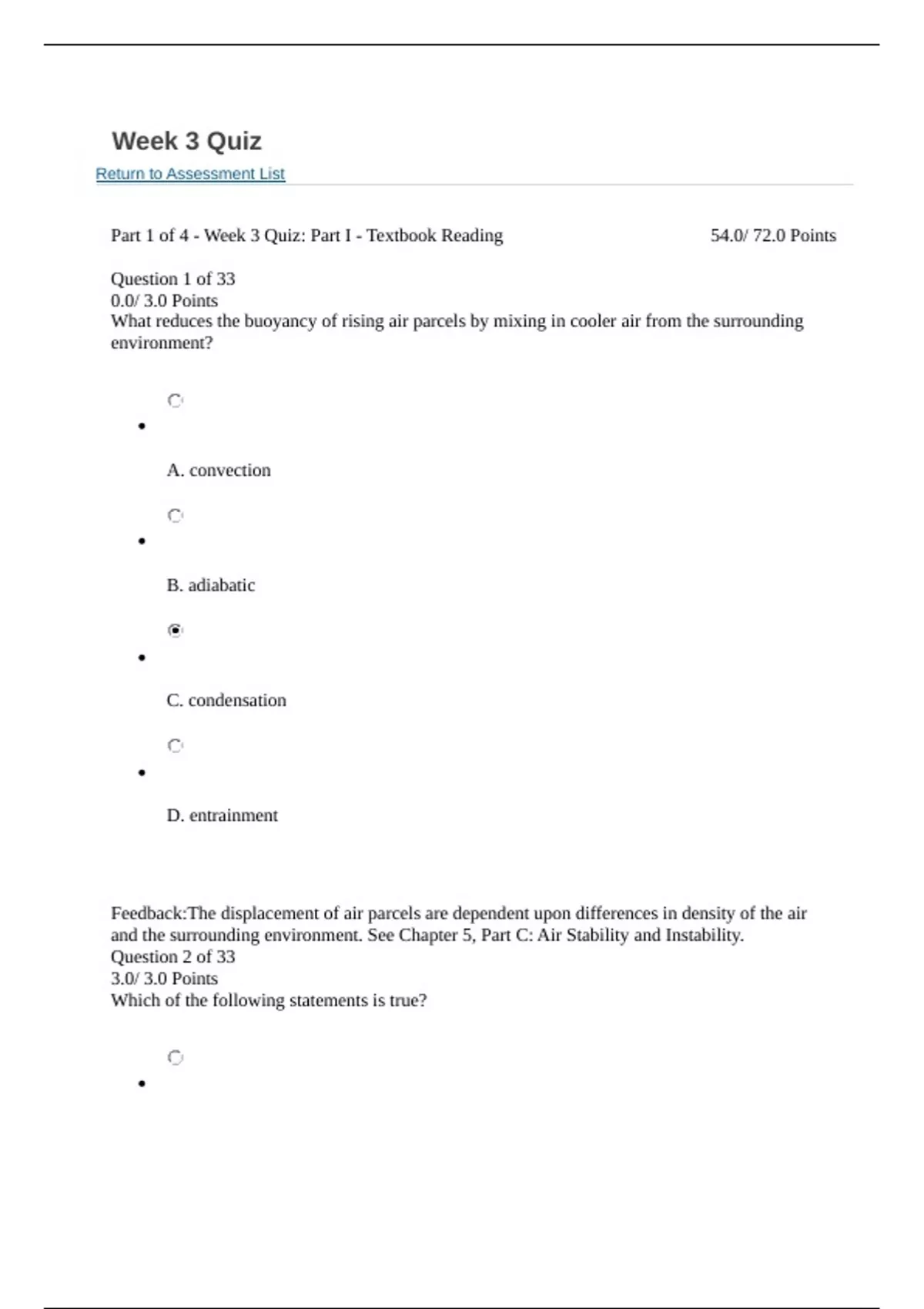 Week 3 Quiz Return to Assessment List Part 1 of 4 - Week 3 Quiz: Part I - Textbook Reading 54.0/ 72.0 Points Question 1 of 33 0.0/ 3.0 Points What reduces the buoyancy of rising air parcels by mixing in cooler air from the surrounding environment? A. convection B. adiabatic C. condensation D. entrainment Feedback:The displacement of air parcels are dependent upon differences in density of the air and the surrounding environment. See Chapter 5, Part C: Air Stability and Instability. Question 2 of 33 3.0/ 3.0 Points Which of the following statements is true? A. Both rising and sinking air cools. B. Rising air warms, while sinking air cools C. Both rising and sinking air warms. D. Rising air cools, while sinking air warms. Question 3 of 33 3.0/ 3.0 Points What are contour lines of constant pressure? A. isobars B. dry adiabats C. mixing ratio