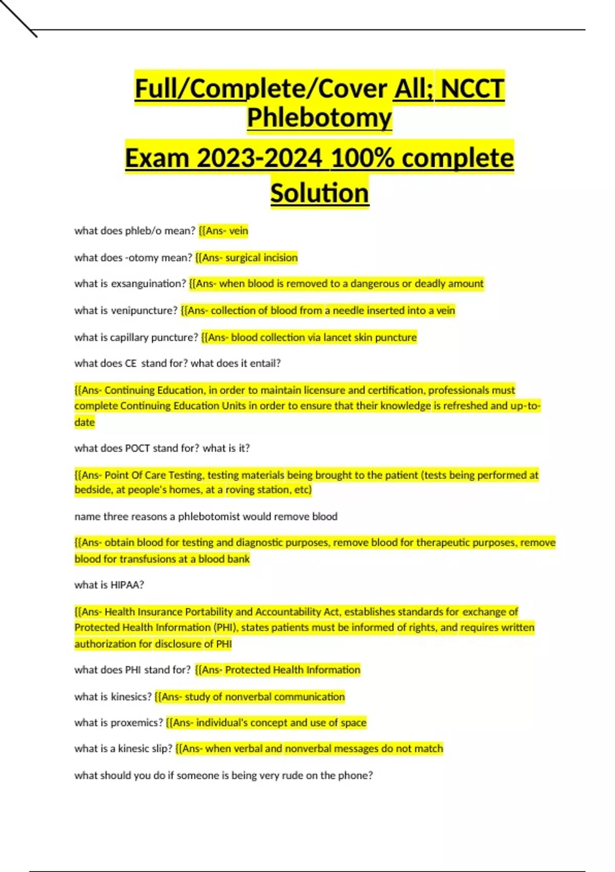 Full/Complete/Cover All; NCCT Phlebotomy Exam % complete Solution