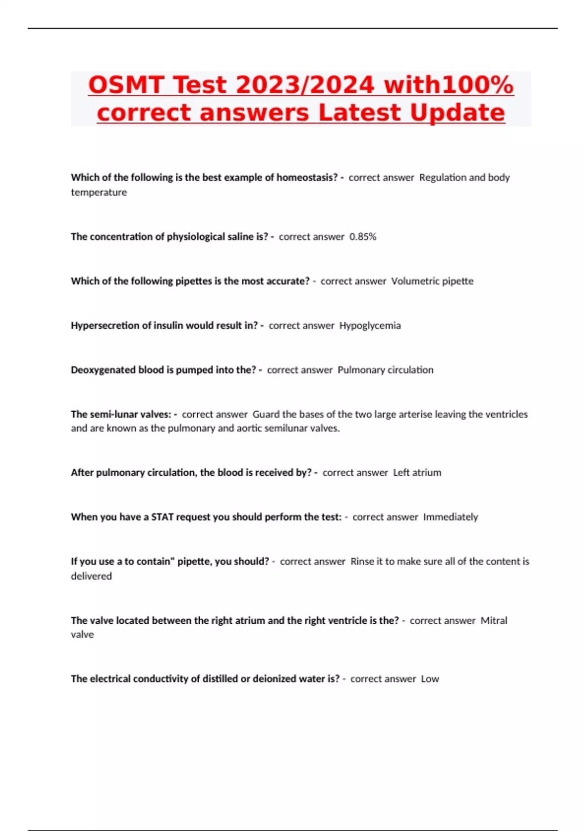 OSMT Test 2023/2024 with100% correct answers Latest Update Which of the following is the best example of homeostasis? - correct answer Regulation and body temperature The concentration of physiological saline is? - correct answer 0.85% Which of the following pipettes is the most accurate? - correct answer Volumetric pipette Hypersecretion of insulin would result in? - correct answer Hypoglycemia Deoxygenated blood is pumped into the? - correct answer Pulmonary circulation The semi-lunar valves: - correct answer Guard the bases of the two large arterise leaving the ventricles and are known as the pulmonary and aortic semilunar valves. After pulmonary circulation, the blood is received by? - correct answer Left atrium When you have a STAT request you should perform the test: - correct answer Immediately If you use a to contain" pipette, you should? - correct answer Rinse it to make sure all of the content is delivered The valve located between the right atrium and the right ventricle is the? - correct answer Mitral valve The electrical conductivity of distilled or deionized water is? - correct answer Low