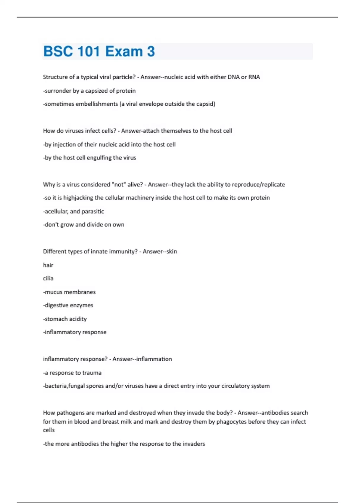 Structure of a typical viral particle? - Answer--nucleic acid with either DNA or RNA -surronder by a capsized of protein -sometimes embellishments (a viral envelope outside the capsid) How do viruses infect cells? - Answer-attach themselves to the host cell -by injection of their nucleic acid into the host cell -by the host cell engulfing the virus Why is a virus considered "not" alive? - Answer--they lack the ability to reproduce/replicate -so it is highjacking the cellular machinery inside the host cell to make its own protein -acellular, and parasitic -don't grow and divide on own Different types of innate immunity? - Answer--skin hair cilia -mucus membranes -digestive enzymes -stomach acidity -inflammatory response inflammatory response? - Answer--inflammation -a response to trauma -bacteria,fungal spores and/or viruses have a direct entry into your circulatory system How pathogens are marked and destroyed when they invade the body? - Answer--antibodies search for them in blood and breast milk and mark and destroy them by phagocytes before they can infect cells -the more antibodies the higher the response to the invadersHow vaccinations can cause secondary response? - Answer--put a small amount of the pathogen in you which creates memory cells or antibodies to kill it off it returns How herd immunity works? - Answer--indirect form of protection from the infectious disease that occurs when a large percent of a population has become immune to the infection Why everyone who is medically capable should get vaccinated? - Answer--vaccinations have to be at 95% of people or above in order for a disease to disappear -not enough people are vaccinated to keep the diseases away How fats are digested? - Answer--most fats have a long chain of carbons with hydrogen atoms attached, digested by enzymes breaking the carbon bonds