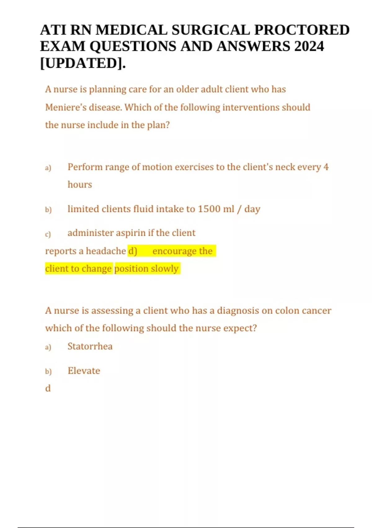 ATI RN MEDICAL SURGICAL PROCTORED EXAM QUESTIONS AND ANSWERS 2024 [UPDATED]. A nurse is planning care for an older adult client who has Meniere's disease. Which of the following interventions should the nurse include in the plan? a) Perform range of motion exercises to the client's neck every 4 hours b) limited clients fluid intake to 1500 ml / day c) administer aspirin if the client reports a headache d) encourage the client to change position slowly A nurse is assessing a client who has a diagnosis on colon cancer which of the following should the nurse expect? a) Statorrhea b) Elevate d ATI RN MEDICAL SURGICAL PROCTORED EXAM QUESTIONS AND ANSWERS 2024 [UPDATED]. hemoglobin c) Hematochezia d) Weight gain A nurse is assessing a client admitted with peripheral vascular disease,. Which of the following findings indicates a venous vascular disorder? a) An ulcer at the tip of a toe b) Hair loss distal to the clients calves c) Leg pain at rest d) Edema of the ankle A nurse is caring for a client who is receiving radiation. The client reports nausea since the therapy was initiated. Which of the following considerations should the nurse include when finding the clients meals? a) Offer hot beverages with meals b) offer a snack prior to radiation therapy c) offer highly seasoned Foods d) offer frequent High carbohydrate meals A charge nurse receives a call from the house supervisor requesting room assignments for four new clients. Based on the information diagnosis which of the following clients requires a private room? a) A client service port reports having fever, night sweats, and call for 2 days b) an older adult client who was admitted with aspiration pneumonia c) a client who has diabetes mellitus and is presenting with acute ketoacidosis d) a client who has a compound fracture of the right femur A nurse in an emergency department is assessing a client who has diabetic ketoacidosis. Which of the following findings should the nurse expect? (select all the apply) a) Tremors b) reports of nausea and vomiting c) Serum glucose 380 mg / DL d) serum pH 7.6 e) fruity smelling breath.