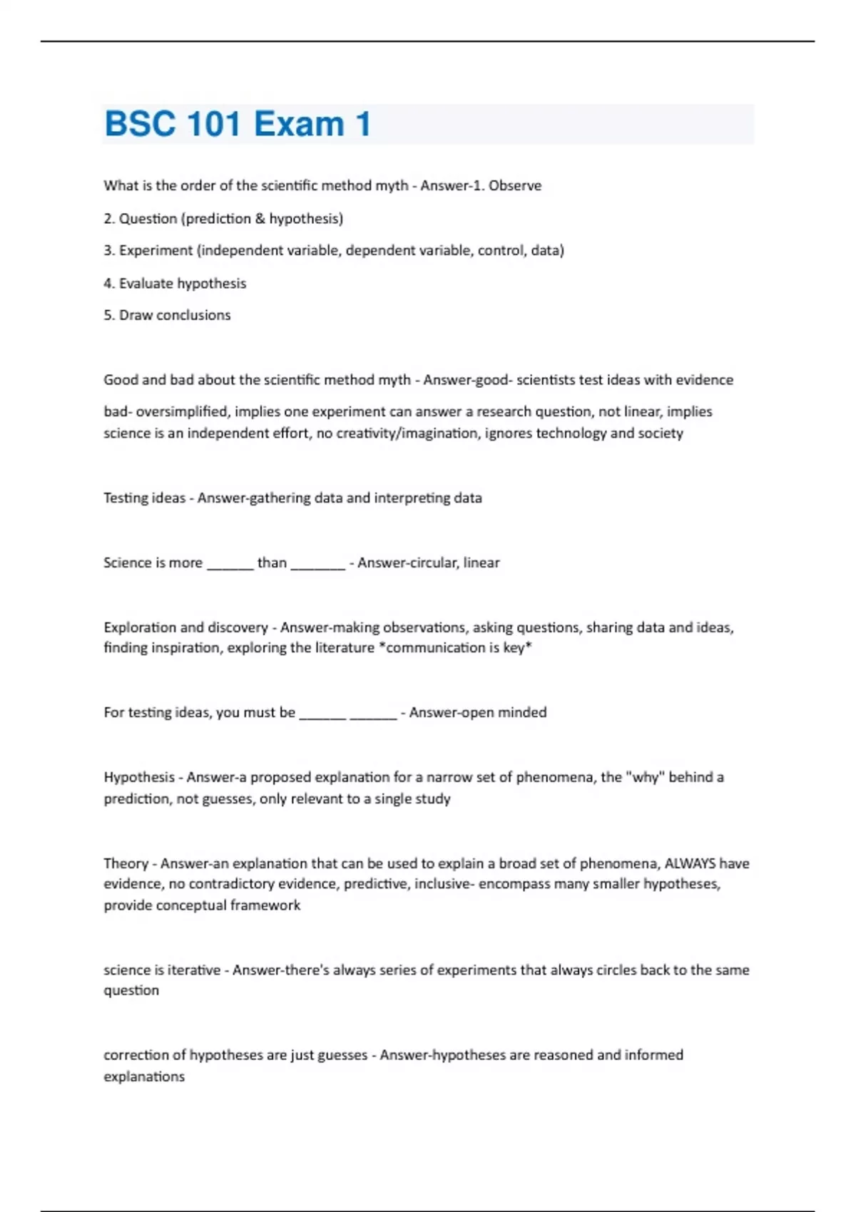What is the order of the scientific method myth - Answer-1. Observe 2. Question (prediction & hypothesis) 3. Experiment (independent variable, dependent variable, control, data) 4. Evaluate hypothesis 5. Draw conclusions Good and bad about the scientific method myth - Answer-good- scientists test ideas with evidence bad- oversimplified, implies one experiment can answer a research question, not linear, implies science is an independent effort, no creativity/imagination, ignores technology and society Testing ideas - Answer-gathering data and interpreting data Science is more ______ than _______ - Answer-circular, linear Exploration and discovery - Answer-making observations, asking questions, sharing data and ideas, finding inspiration, exploring the literature *communication is key* For testing ideas, you must be ______ ______ - Answer-open minded Hypothesis - Answer-a proposed explanation for a narrow set of phenomena, the "why" behind a prediction, not guesses, only relevant to a single study Theory - Answer-an explanation that can be used to explain a broad set of phenomena, ALWAYS have evidence, no contradictory evidence, predictive, inclusive- encompass many smaller hypotheses, provide conceptual framework science is iterative - Answer-there's always series of experiments that always circles back to the same question correction of hypotheses are just guesses - Answer-hypotheses are reasoned and informed explanationscorrection of theories are just hunches - Answer-theories are broad explanations. they are supported by many lines of evidence correction of if evidence supports a hypothesis, it is upgraded to a theory. if the theory then garners even more support, it is upgraded to a law - Answer-hypotheses, theories, and laws differ in breadth and the kind of explanation they provide roles of the scientific community - Answer-1. critics and fact-checkers (before a scientific article becomes published) 2. collaborative generation of new ideas 3. watchdogs for bias and fraud 4. mutual motivation (help motivate each other)