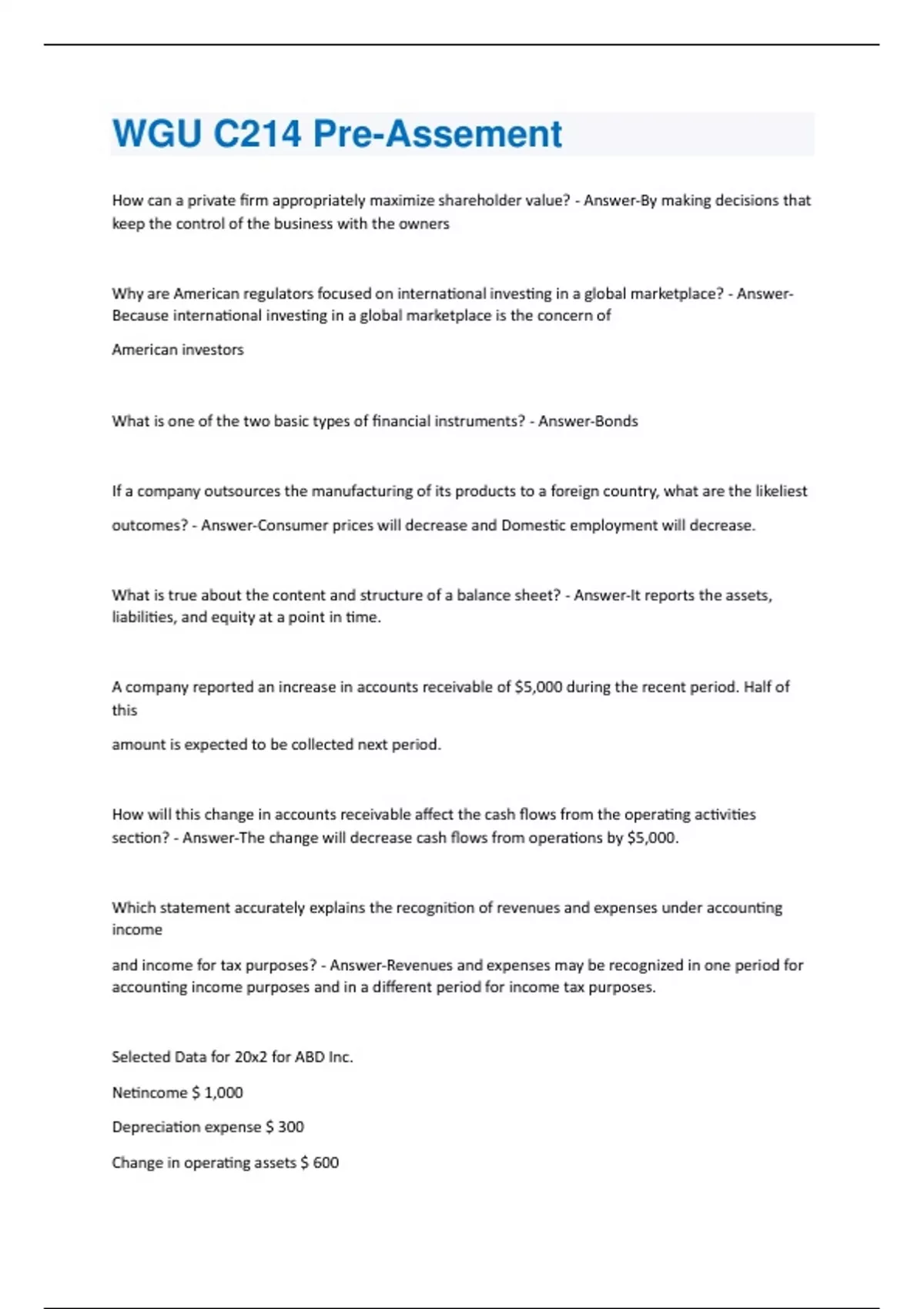 How can a private firm appropriately maximize shareholder value? - Answer-By making decisions that keep the control of the business with the owners Why are American regulators focused on international investing in a global marketplace? - AnswerBecause international investing in a global marketplace is the concern of American investors What is one of the two basic types of financial instruments? - Answer-Bonds If a company outsources the manufacturing of its products to a foreign country, what are the likeliest outcomes? - Answer-Consumer prices will decrease and Domestic employment will decrease. What is true about the content and structure of a balance sheet? - Answer-It reports the assets, liabilities, and equity at a point in time. A company reported an increase in accounts receivable of $5,000 during the recent period. Half of this amount is expected to be collected next period. How will this change in accounts receivable affect the cash flows from the operating activities section? - Answer-The change will decrease cash flows from operations by $5,000. Which statement accurately explains the recognition of revenues and expenses under accounting income and income for tax purposes? - Answer-Revenues and expenses may be recognized in one period for accounting income purposes and in a different period for income tax purposes. Selected Data for 20x2 for ABD Inc. Netincome $ 1,000 Depreciation expense $ 300 Change in operating assets $ 600Change in net property, plant, and equipment$ 5,000 Changes in long-term liabilities $ 1,000 Dividends paid $ 200 What is the firm's cash flow from investments, using the data above and assuming no asset disposals? - Answer-$5,300 outflow What is the basic equation for a balance sheet? - Answer-Assets = Liabilities + Equity What do cash flows from investing activities generally relate to? - Answer-A firm's purchase and sale of long-term assets Which transaction is reflected in cash flow from operating activities? - Answer-Cash sales to customers