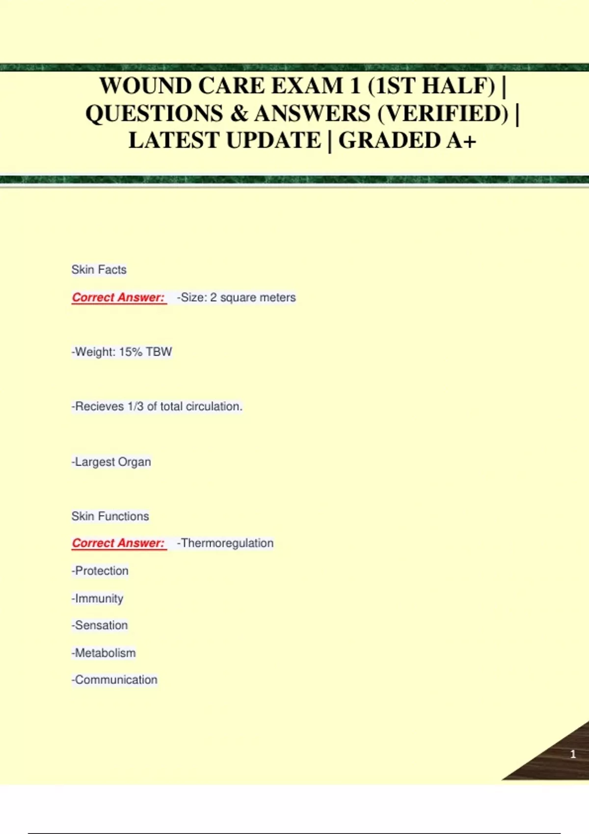 WOUND CARE EXAM 1 (1ST HALF) | QUESTIONS & ANSWERS (VERIFIED) | LATEST UPDATE | GRADED A+WOUND CARE EXAM 1 (1ST HALF) | QUESTIONS & ANSWERS (VERIFIED) | LATEST UPDATE | GRADED A+