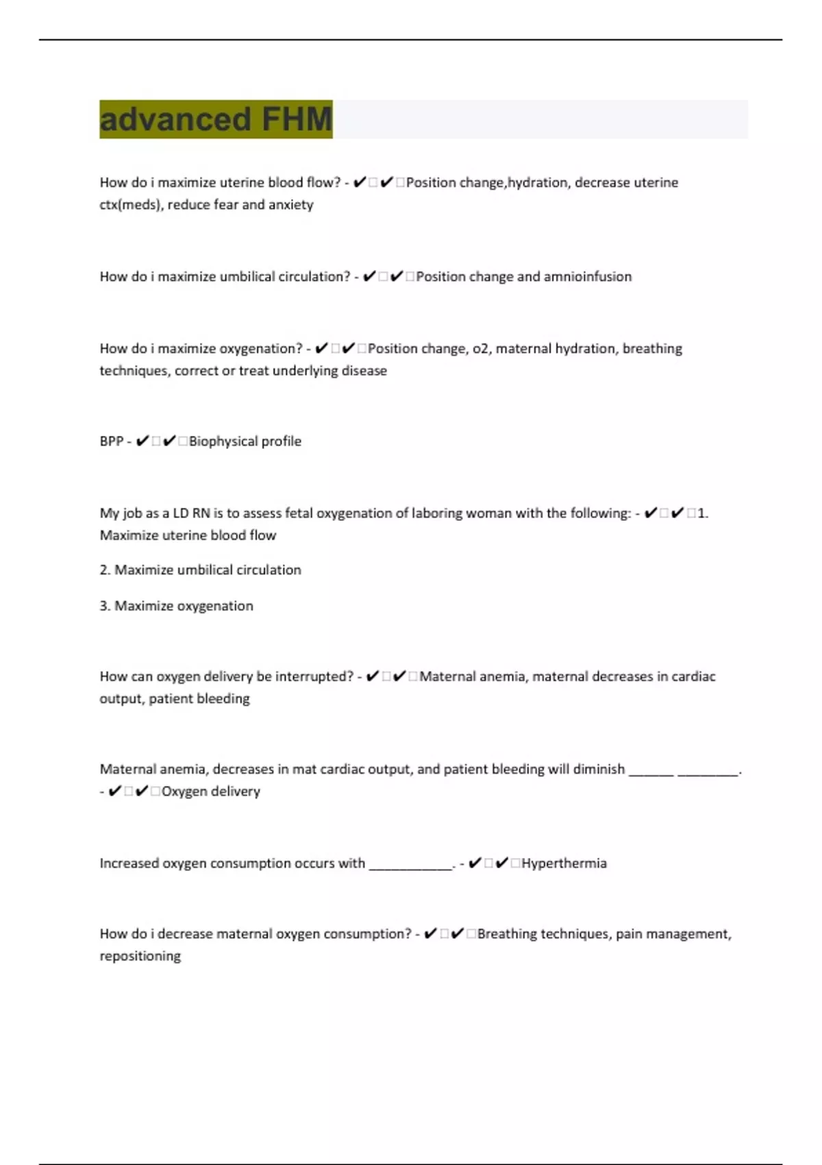 How do i maximize uterine blood flow? - ️️Position change,hydration, decrease uterine ctx(meds), reduce fear and anxiety How do i maximize umbilical circulation? - ️️Position change and amnioinfusion How do i maximize oxygenation? - ️️Position change, o2, maternal hydration, breathing techniques, correct or treat underlying disease BPP - ️️Biophysical profile My job as a LD RN is to assess fetal oxygenation of laboring woman with the following: - ️️1. Maximize uterine blood flow 2. Maximize umbilical circulation 3. Maximize oxygenation How can oxygen delivery be interrupted? - ️️Maternal anemia, maternal decreases in cardiac output, patient bleeding Maternal anemia, decreases in mat cardiac output, and patient bleeding will diminish ______ ________. - ️️Oxygen delivery Increased oxygen consumption occurs with ___________. - ️️Hyperthermia How do i decrease maternal oxygen consumption? - ️️Breathing techniques, pain management, repositioning