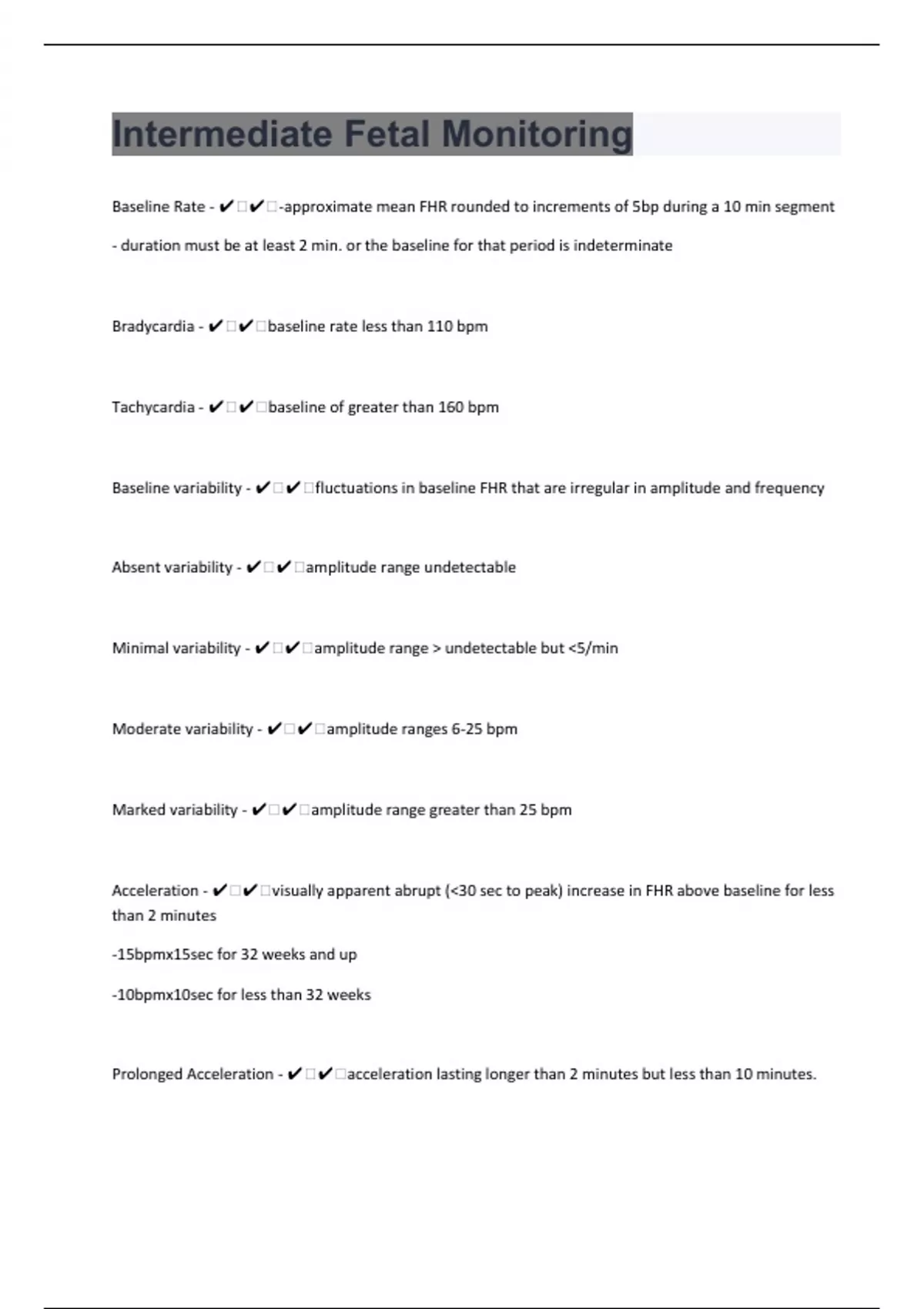 Baseline Rate - ️️-approximate mean FHR rounded to increments of 5bp during a 10 min segment - duration must be at least 2 min. or the baseline for that period is indeterminate Bradycardia - ️️baseline rate less than 110 bpm Tachycardia - ️️baseline of greater than 160 bpm Baseline variability - ️️fluctuations in baseline FHR that are irregular in amplitude and frequency Absent variability - ️️amplitude range undetectable Minimal variability - ️️amplitude range undetectable but 5/min Moderate variability - ️️amplitude ranges 6-25 bpm Marked variability - ️️amplitude range greater than 25 bpm Acceleration - ️️visually apparent abrupt (30 sec to peak) increase in FHR above baseline for less than 2 minutes -15bpmx15sec for 32 weeks and up -10bpmx10sec for less than 32 weeks Prolonged Acceleration - ️️acceleration lasting longer than 2 minutes but less than 10 minutes.
