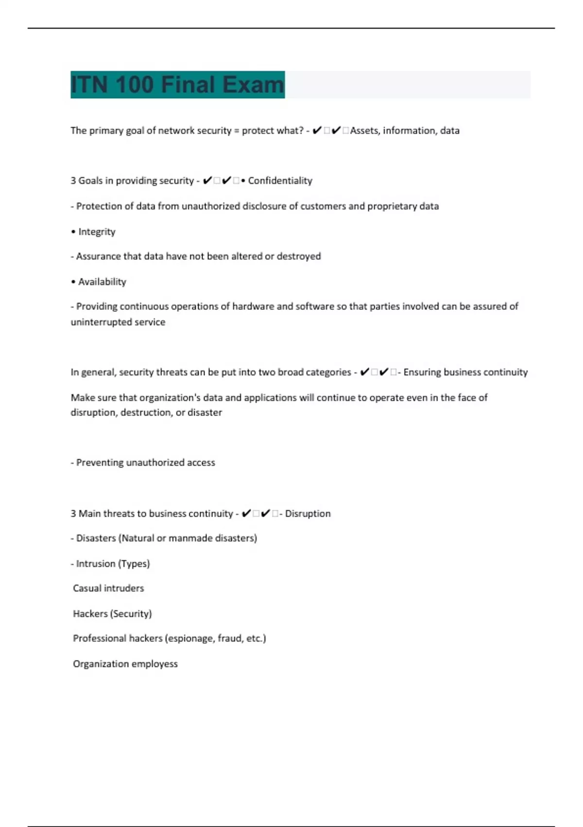 The primary goal of network security = protect what? - ️️Assets, information, data 3 Goals in providing security - ️️• Confidentiality - Protection of data from unauthorized disclosure of customers and proprietary data • Integrity - Assurance that data have not been altered or destroyed • Availability - Providing continuous operations of hardware and software so that parties involved can be assured of uninterrupted service In general, security threats can be put into two broad categories - ️️- Ensuring business continuity Make sure that organization's data and applications will continue to operate even in the face of disruption, destruction, or disaster - Preventing unauthorized access 3 Main threats to business continuity - ️️- Disruption - Disasters (Natural or manmade disasters) - Intrusion (Types) Casual intruders Hackers (Security) Professional hackers (espionage, fraud, etc.) Organization employess