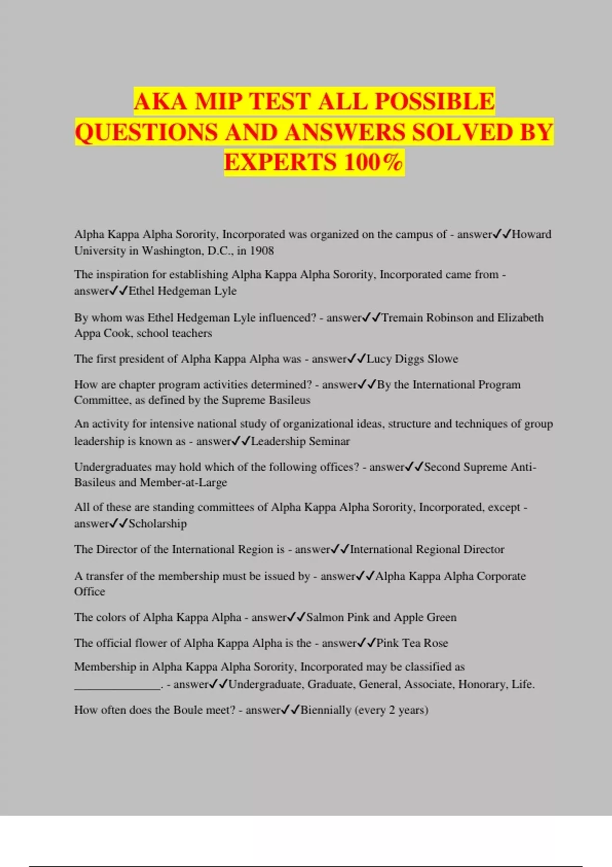 AKA MIP TEST ALL POSSIBLE QUESTIONS AND ANSWERS SOLVED BY EXPERTS 100% Alpha Kappa Alpha Sorority, Incorporated was organized on the campus of - answerHoward University in Washington, D.C., in 1908 The inspiration for establishing Alpha Kappa Alpha Sorority, Incorporated came from - answerEthel Hedgeman Lyle By whom was Ethel Hedgeman Lyle influenced? - answerTremain Robinson and Elizabeth Appa Cook, school teachers The first president of Alpha Kappa Alpha was - answerLucy Diggs Slowe How are chapter program activities determined? - answerBy the International Program Committee, as defined by the Supreme Basileus An activity for intensive national study of organizational ideas, structure and techniques of group leadership is known as - answerLeadership Seminar Undergraduates may hold which of the following offices? - answerSecond Supreme Anti- Basileus and Member-at-Large All of these are standing committees of Alpha Kappa Alpha Sorority, Incorporated, except - answerScholarship The Director of the International Region is - answerInternational Regional Director A transfer of the membership must be issued by - answerAlpha Kappa Alpha Corporate Office The colors of Alpha Kappa Alpha - answerSalmon Pink and Apple Green The official flower of Alpha Kappa Alpha is the - answerPink Tea Rose Membership in Alpha Kappa Alpha Sorority, Incorporated may be classified as ______________. - answerUndergraduate, Graduate, General, Associate, Honorary, Life. How often does the Boule meet? - answerBiennially (every 2 years) How many individuals were in the original group? - answer9 What are the names of the original founders of Alpha Kappa Alpha Sorority, Inc.? - answerEthel Hedgeman Lyle, Anna Easter Brown, Beulah Burke, Lillie Burke, Marjorie Hill, Margaret Flagg Holmes, Lavinia Norman, Lucy Diggs Slowe, Marie Taylor Name two facts about Ethel Hedgeman Lyle - answerNamed honorary Basileus (president) at 1926 Boule—a title she carried until her d