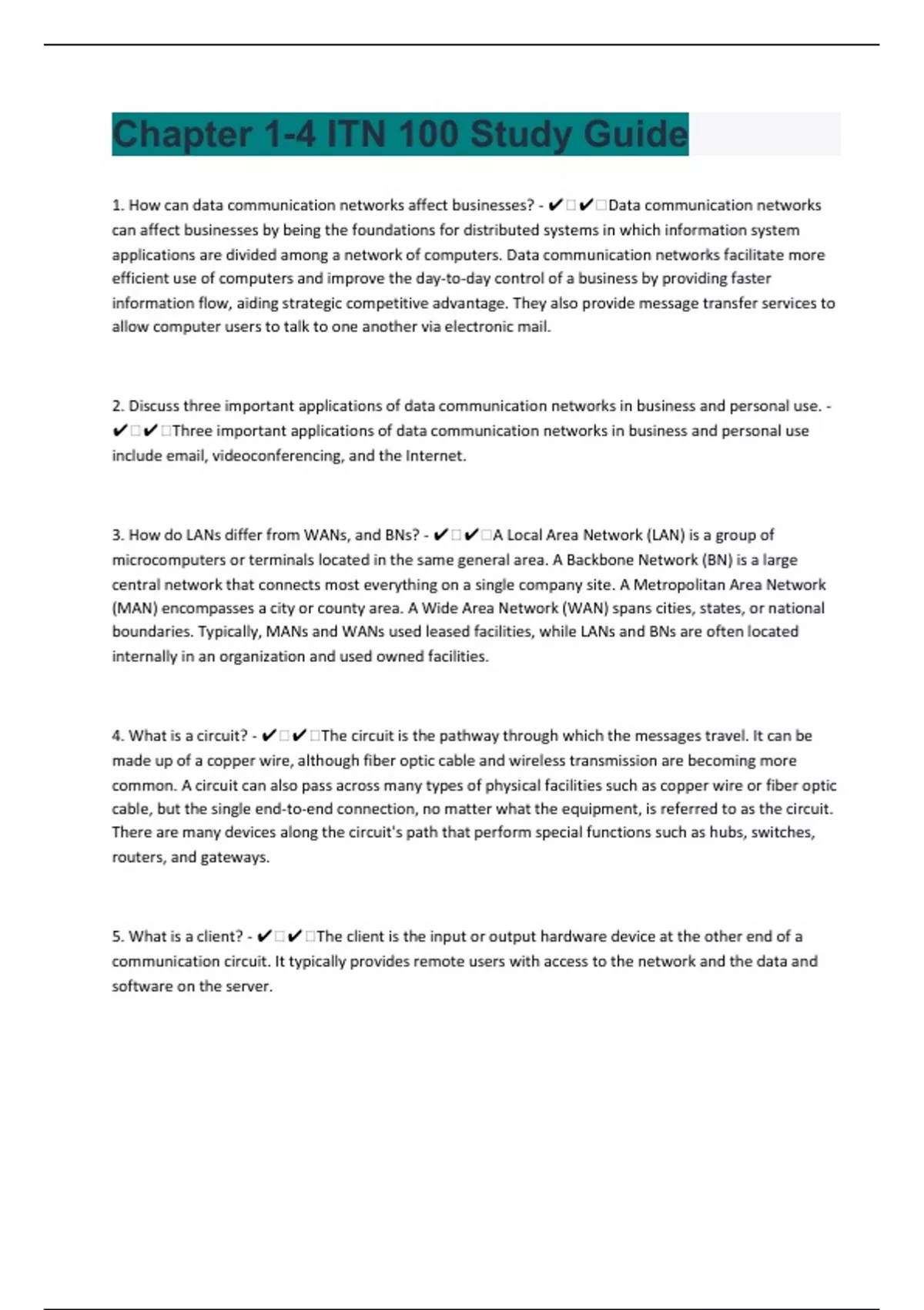 1. How can data communication networks affect businesses? - ️️Data communication networks can affect businesses by being the foundations for distributed systems in which information system applications are divided among a network of computers. Data communication networks facilitate more efficient use of computers and improve the day-to-day control of a business by providing faster information flow, aiding strategic competitive advantage. They also provide message transfer services to allow computer users to talk to one another via electronic mail. 2. Discuss three important applications of data communication networks in business and personal use. - ️️Three important applications of data communication networks in business and personal use include email, videoconferencing, and the Internet. 3. How do LANs differ from WANs, and BNs? - ️️A Local Area Network (LAN) is a group of microcomputers or terminals located in the same general area. A Backbone Network (BN) is a large central network that connects most everything on a single company site. A Metropolitan Area Network (MAN) encompasses a city or county area. A Wide Area Network (WAN) spans cities, states, or national boundaries. Typically, MANs and WANs used leased facilities, while LANs and BNs are often located internally in an organization and used owned facilities. 4. What is a circuit? - ️️The circuit is the pathway through which the messages travel. It can be made up of a copper wire, although fiber optic cable and wireless transmission are becoming more common. A circuit can also pass across many types of physical facilities such as copper wire or fiber optic cable, but the single end-to-end connection, no matter what the equipment, is referred to as the circuit. There are many devices along the circuit's path that perform special functions such as hubs, switches, routers, and gateways. 5. What is a client? - ️️The client is the input or output hardware device at the other end of a communication circuit. It typically provides remote users with access to the network and the data and software on the server.