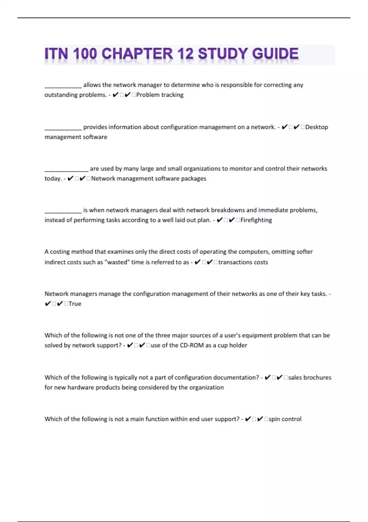 ___________ allows the network manager to determine who is responsible for correcting any outstanding problems. - ️️Problem tracking ___________ provides information about configuration management on a network. - ️️Desktop management software _____________ are used by many large and small organizations to monitor and control their networks today. - ️️Network management software packages ___________ is when network managers deal with network breakdowns and immediate problems, instead of performing tasks according to a well laid out plan. - ️️Firefighting A costing method that examines only the direct costs of operating the computers, omitting softer indirect costs such as "wasted" time is referred to as - ️️transactions costs Network managers manage the configuration management of their networks as one of their key tasks. - ️️True Which of the following is not one of the three major sources of a user's equipment problem that can be solved by network support? - ️️use of the CD-ROM as a cup holder Which of the following is typically not a part of configuration documentation? - ️️sales brochures for new hardware products being considered by the organization Which of the following is not a main function within end user support? - ️️spin control