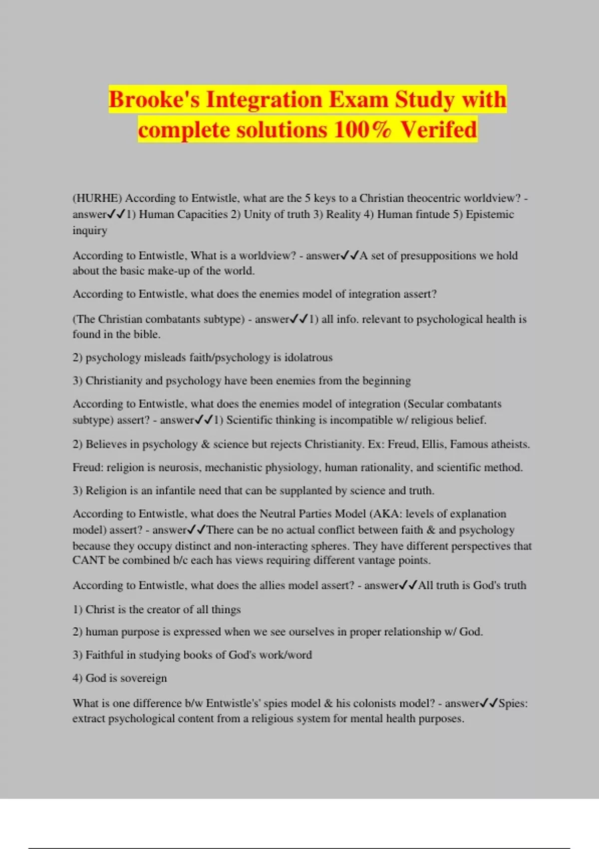 Brooke's Integration Exam Study with complete solutions 100% Verifed (HURHE) According to Entwistle, what are the 5 keys to a Christian theocentric worldview? - answer1) Human Capacities 2) Unity of truth 3) Reality 4) Human fintude 5) Epistemic inquiry According to Entwistle, What is a worldview? - answerA set of presuppositions we hold about the basic make-up of the world. According to Entwistle, what does the enemies model of integration assert? (The Christian combatants subtype) - answer1) all info. relevant to psychological health is found in the bible. 2) psychology misleads faith/psychology is idolatrous 3) Christianity and psychology have been enemies from the beginning According to Entwistle, what does the enemies model of integration (Secular combatants subtype) assert? - answer1) Scientific thinking is incompatible w/ religious belief. 2) Believes in psychology & science but rejects Christianity. Ex: Freud, Ellis, Famous atheists. Freud: religion is neurosis, mechanistic physiology, human rationality, and scientific method. 3) Religion is an infantile need that can be supplanted by science and truth. According to Entwistle, what does the Neutral Parties Model (AKA: levels of explanation model) assert? - answerThere can be no actual conflict between faith & and psychology because they occupy distinct and non-interacting spheres. They have different perspectives that CANT be combined b/c each has views requiring different vantage points. According to Entwistle, what does the allies model assert? - answerAll truth is God's truth 1) Christ is the creator of all things 2) human purpose is expressed when we see ourselves in proper relationship w/ God. 3) Faithful in studying books of God's work/word 4) God is sovereign What is one difference b/w Entwistle's' spies model & his colonists model? - answerSpies: extract psychological content from a religious system for mental health purposes. Colonialists: belong to conservative systems, borrow selective finding from psychology. Which of Entwistle's models emphasizes God's word over God's works? - answerColonialist model The integration of psychology & Christianity is a multifaced attempt to discern the underlying truths about nature & functioning of human beings from the unique vantage points of psychology and Christianity. Which of Entwistle's model best fits this definition? - answerAllies Model According to Entwistle, what is an epistemological assumption made by the enemies model? (Christian combatants version) - answerdenying the sufficiency of Christ Many who subscribe to the Enemies model (Christian Combatants) believe what? - answerCounseling is the church's resp