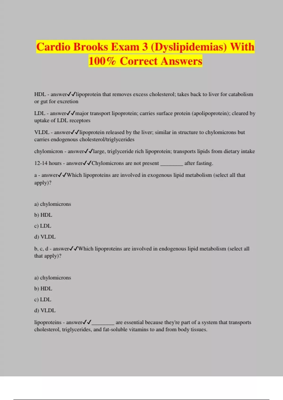 Cardio Brooks Exam 3 (Dyslipidemias) With 100% Correct Answers