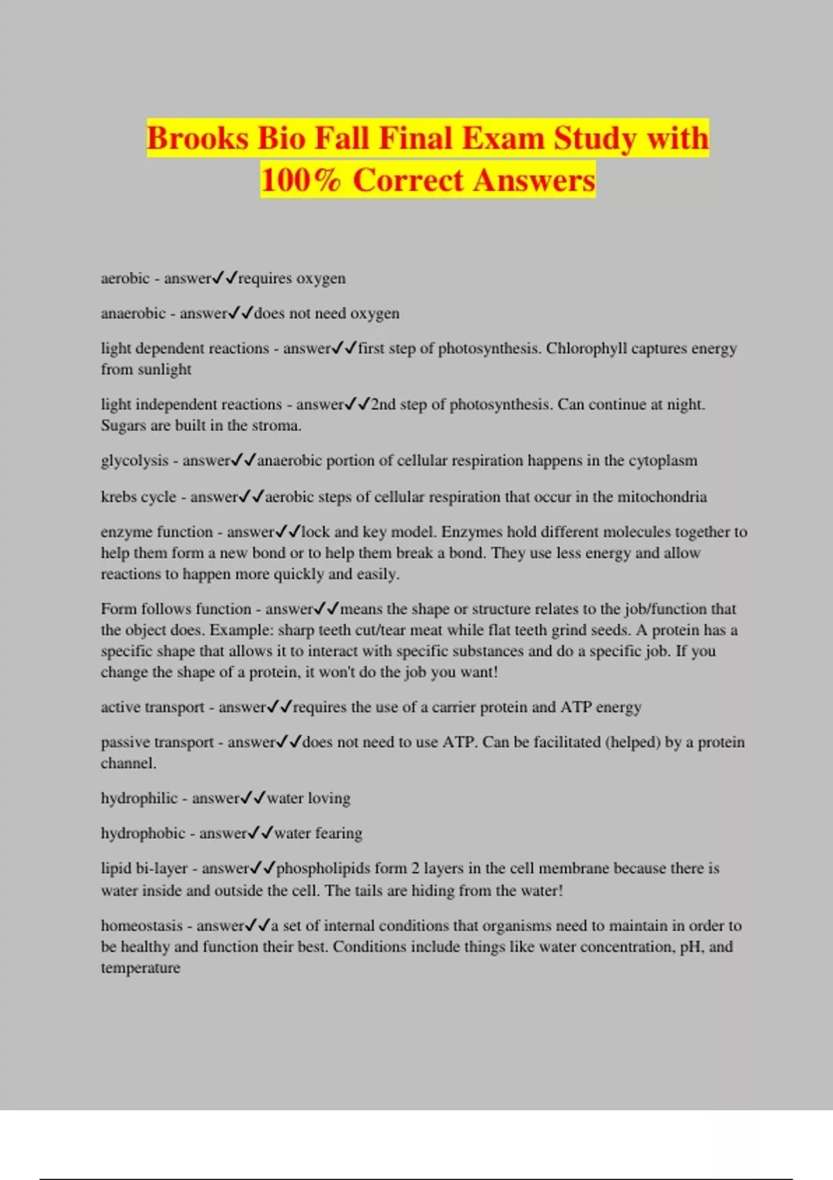 Brooks Bio Fall Final Exam Study with 100% Correct Answers aerobic - answerrequires oxygen anaerobic - answerdoes not need oxygen light dependent reactions - answerfirst step of photosynthesis. Chlorophyll captures energy from sunlight light independent reactions - answer2nd step of photosynthesis. Can continue at night. Sugars are built in the stroma. glycolysis - answeranaerobic portion of cellular respiration happens in the cytoplasm krebs cycle - answeraerobic steps of cellular respiration that occur in the mitochondria enzyme function - answerlock and key model. Enzymes hold different molecules together to help them form a new bond or to help them break a bond. They use less energy and allow reactions to happen more quickly and easily. Form follows function - answermeans the shape or structure relates to the job/function that the object does. Example: sharp teeth cut/tear meat while flat teeth grind seeds. A protein has a specific shape that allows it to interact with specific substances and do a specific job. If you change the shape of a protein, it won't do the job you want! active transport - answerrequires the use of a carrier protein and ATP energy passive transport - answerdoes not need to use ATP. Can be facilitated (helped) by a protein channe