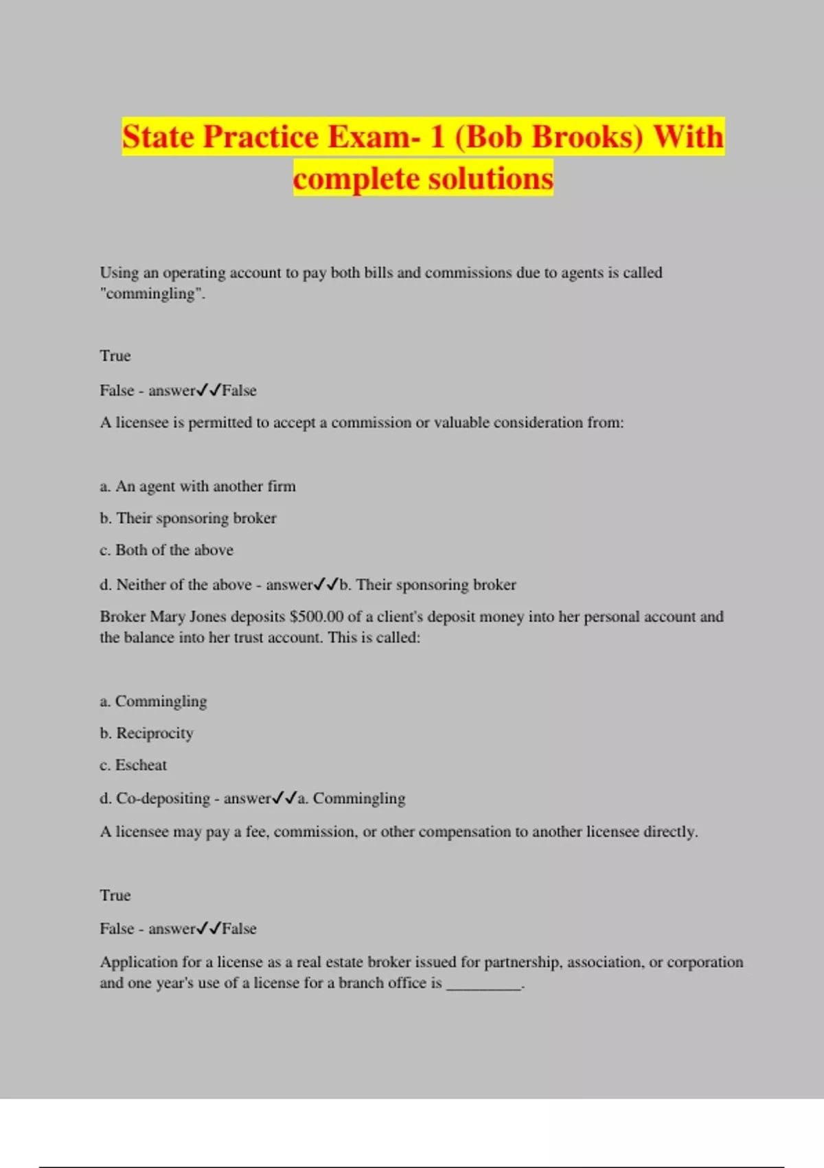 State Practice Exam- 1 (Bob Brooks) With complete solutions Using an operating account to pay both bills and commissions due to agents is called "commingling". True False - answerFalse A licensee is permitted to accept a commission or valuable consideration from: a. An agent with another firm b. Their sponsoring broker c. Both of the above d. Neither of the above - answerb. Their sponsoring broker Broker Mary Jones deposits $500.00 of a client's deposit money into her personal account and the balance into her trust account. This is called: a. Commingling b. Reciprocity c. Escheat d. Co-depositing - answera. Commingling A licensee may pay a fee, commission, or other compensation to another licensee directly. True False - answerFalse Application for a license as a real estate broker issued for partnership, association, or corporation and one year's use of a license for a branch office is _________. a. $50.00 b. $80.00 c. $70.00 d. $75.00 - answera. $50.00 The non-resident broker CANNOT place any sign on real property located in the state of Mississippi unless which of the following happens? a. Both A and B b. Neither A nor B c. The non-resident broker has obtained written consent of the cooperating Mississippi broker. d. The sign of the Mississippi broker is placed in a prominent place, in close proximity to the non-resident broker's sign. - answera. Both A and B Enacting real estate laws in Mississippi is the job of the: a. Mississippi Real Estate License Bureau b. Mississippi Real Estate Commission c. Mississippi state legislature d. Mississippi Association of REALTORS® - answerc. Mississippi state legislature A licensee changing from active to inactive status M
