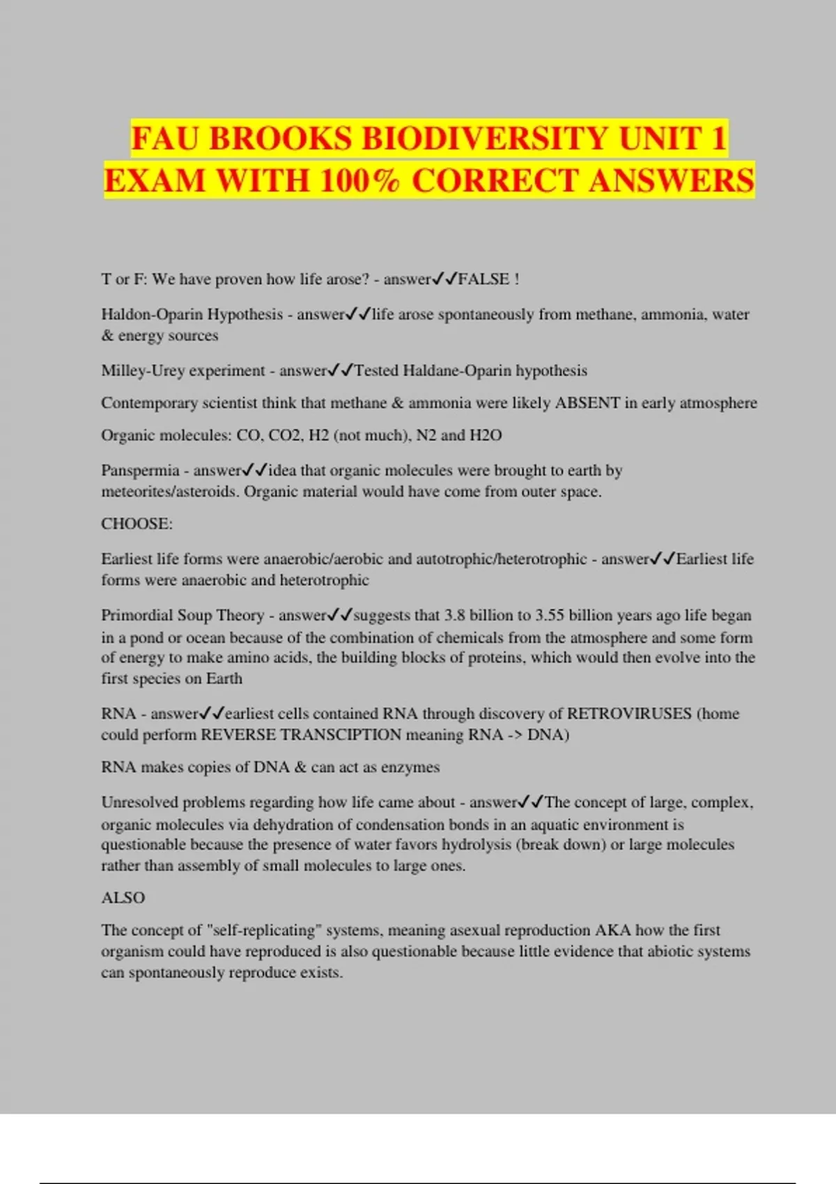 FAU BROOKS BIODIVERSITY UNIT 1 EXAM WITH 100% CORRECT ANSWERS T or F: We have proven how life arose? - answerFALSE ! Haldon-Oparin Hypothesis - answerlife arose spontaneously from methane, ammonia, water & energy sources Milley-Urey experiment - answerTested Haldane-Oparin hypothesis Contemporary scientist think that methane & ammonia were likely ABSENT in early atmosphere Organic molecules: CO, CO2, H2 (not much), N2 and H2O Panspermia - answeridea that organic molecules were brought to earth by meteorites/asteroids. Organic material would have come from outer space. CHOOSE: Earliest life forms were anaerobic/aerobic and autotrophic/heterotrophic - answerEarliest life forms were anaerobic and heterotrophic Primordial Soup Theory - answersuggests that 3.8 billion to 3.55 billion years ago life began in a pond or ocean because of the combination of chemicals from the atmosphere and some form of energy to make amino acids, the building blocks of proteins, which would then evolve into the first species on Earth RNA - answerearliest cells contained RNA through discovery of RETROVIRUSES (home could perform REVERSE TRANSCIPTION meaning RNA -> DNA) RNA makes copies of DNA & can act as enzymes Unresolved problems regarding how life came about - answerThe concept of large, complex, organic molecules via dehydration of condensation bonds in an aquatic environment is questionable because the presence of water favors hydrolysis (break down) or large molecules rather than assembly of small molecules to large ones. ALSO The concept of "self-replicating" systems, meaning asexual reproduction AKA how the first organism could have reproduced is also questionable because little evidence that abiotic systems can spontaneously reproduce exists