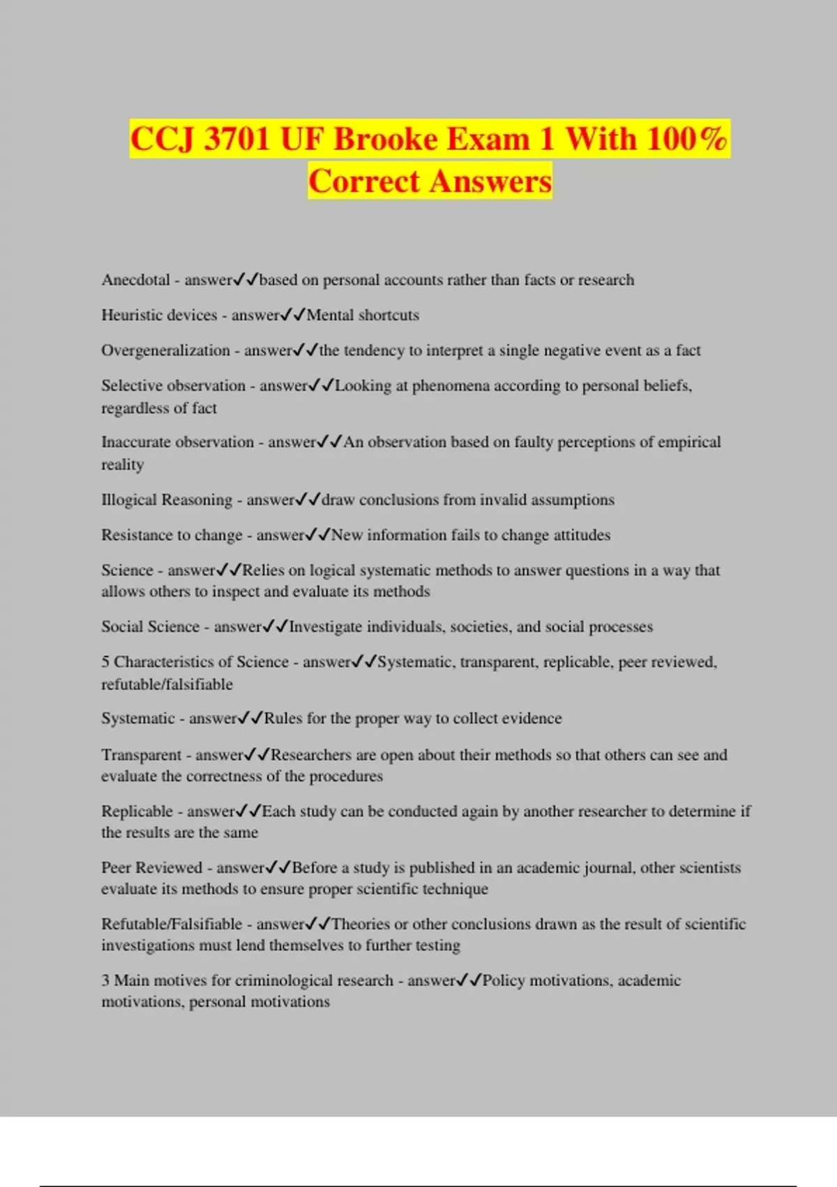 CCJ 3701 UF Brooke Exam 1 With 100% Correct Answers Anecdotal - answerbased on personal accounts rather than facts or research Heuristic devices - answerMental shortcuts Overgeneralization - answerthe tendency to interpret a single negative event as a fact Selective observation - answerLooking at phenomena according to personal beliefs, regardless of fact Inaccurate observation - answerAn observation based on faulty perceptions of empirical reality Illogical Reasoning - answerdraw conclusions from invalid assumptions Resistance to change - answerNew information fails to change attitudes Science - answerRelies on logical systematic methods to answer questions in a way that allows others to inspect and evaluate its methods Social Science - answerInvestigate individuals, societies, and social processes 5 Characteristics of Science - answerSystematic, transparent, replicable, peer reviewed, refutable/falsifiable Systematic - answerRules for the proper way to collect evidence Transparent - answerResearchers are open about their methods so that others can see and evaluate the correctness of the procedures Replicable - answerEach study can be conducted again by another researcher to determine if the results are the same Peer Reviewed - answerBefore a study is published in an academic journal, other scientists evaluate its methods to ensure proper scientific technique Refutable/Falsifiable - answerTheories or other conclusions drawn as the result of scientific investigations must lend themselves to further testing 3 Main motives for criminological research - answerPolicy motivations, academic motivations, personal motivations Four Types of CJ Research - answerDescriptive, Exploratory, Explanatory, Evaluation Descriptive Research - answerDefine and describe, count Example of Descriptive Research - answerHow many youth become involved in gangs? Exploratory Research - answerGather information on newly identified areas/concerns Example of Exploratory Research - answerWhat led a mass shooter to his terrible crime? Explanatory Research - answerCause and effect Example of Explanatory Research - answerDoes the easy availability of firearms influence the gun-homicide rate? Evaluation Research - answerEffects of interve